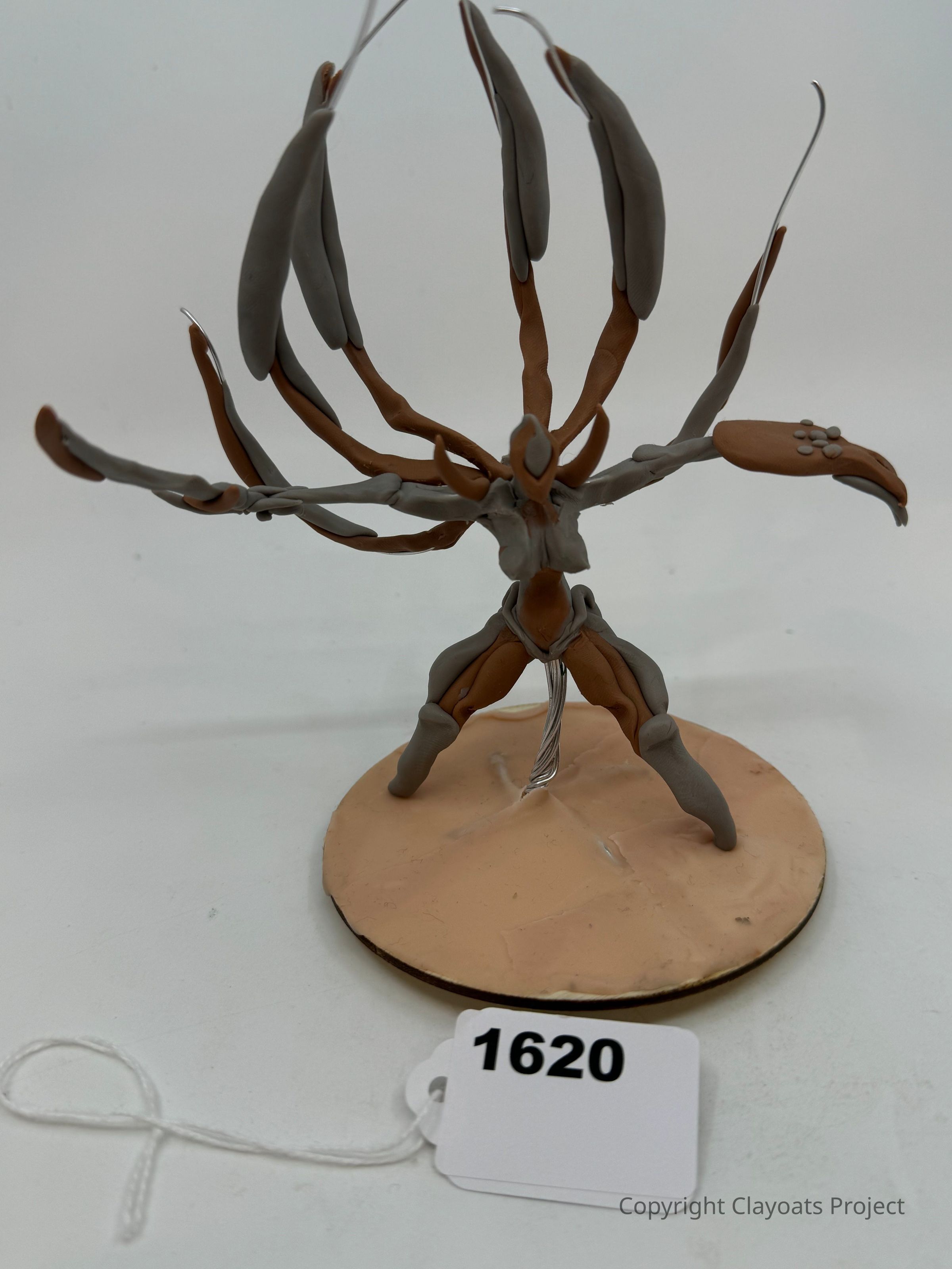 The image depicts a clay sculpture of a humanoid figure with elongated, curved limbs resembling wings or tentacles, positioned on a beige circular base, with a metal wire for support,.