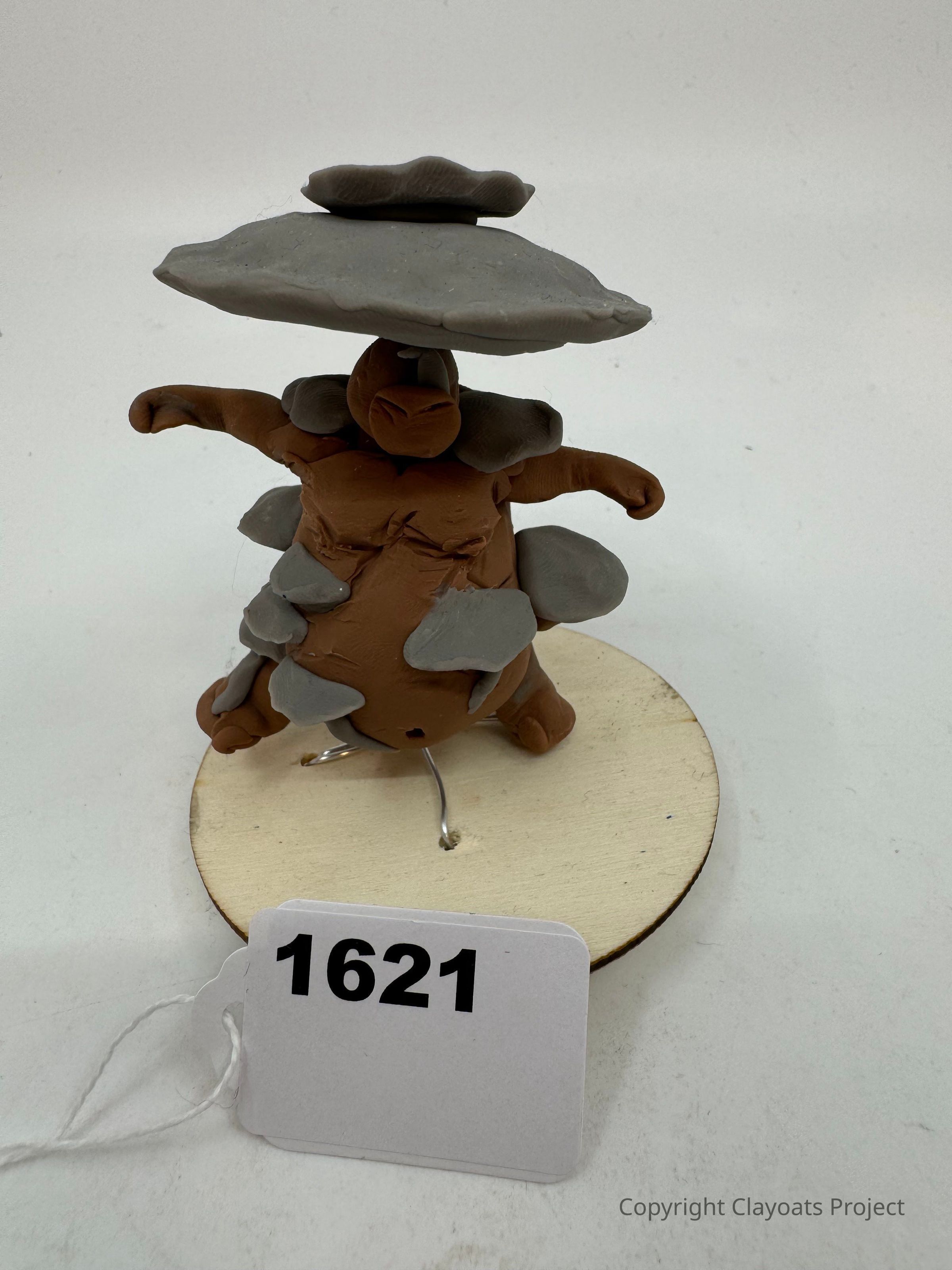 The image depicts a clay sculpture of a whimsical creature standing on a round wooden base. This creature has an earthy brown body adorned with irregular, gray, rock-like protrusions. Its arms are outstretched, and its head is topped with flat, gray, mushroom-like shapes, giving it a natural and organic appearance. In front of the sculpture, The creature stands on small metal supports embedded into the base, providing
