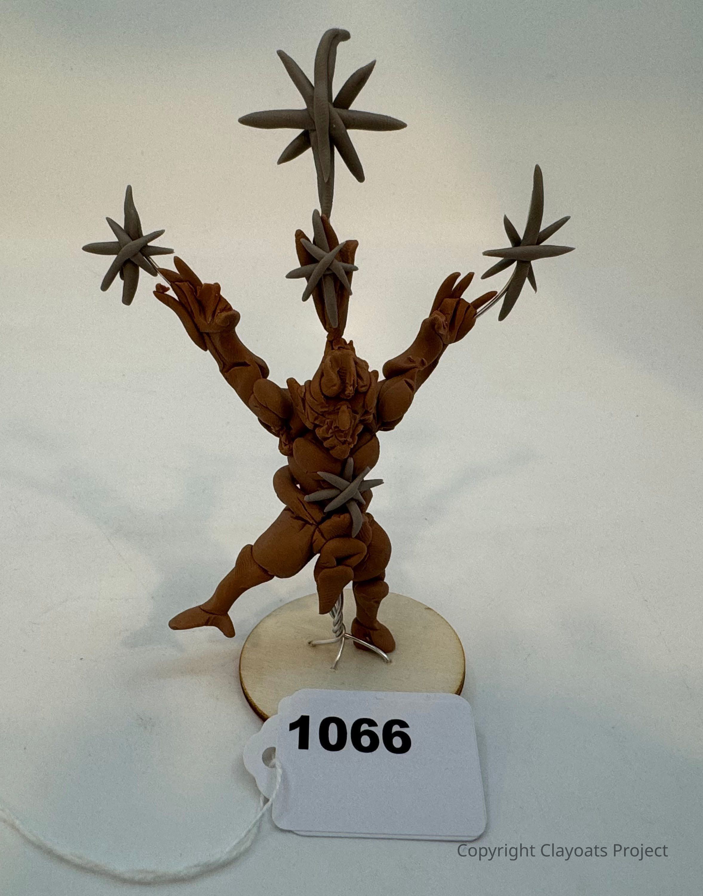 The image features a clay sculpture of an abstract figure balancing six star-shaped objects, one on its head and five others on its outstretched arms and legs, standing on a circular wooden base with a white tag labeled "1066" attached by a string.