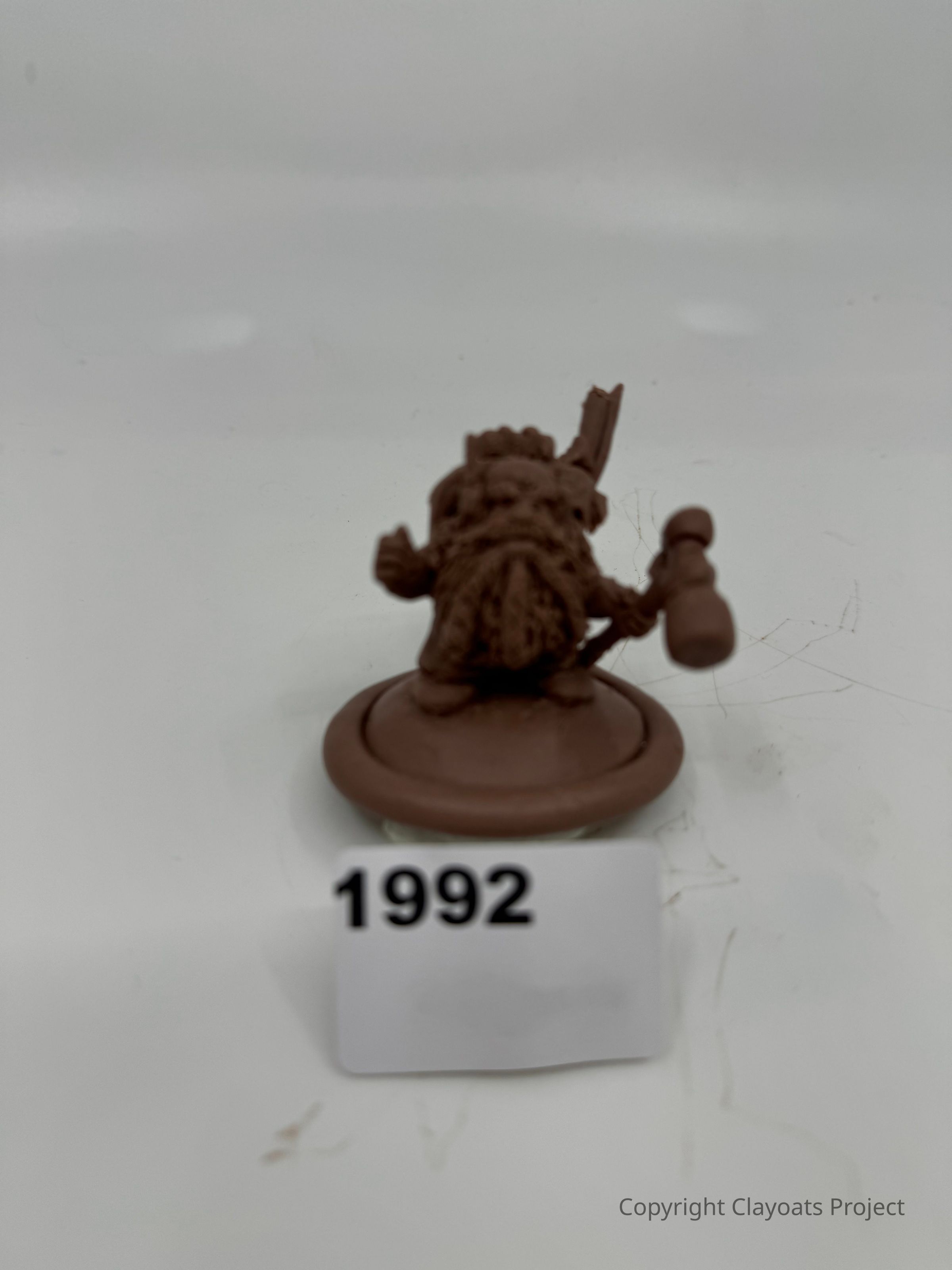 The image depicts a small brown figurine placed on a circular base, appearing to be a miniature model of a character holding an object in one hand, possibly a hammer, with textured details resembling fur or armor.