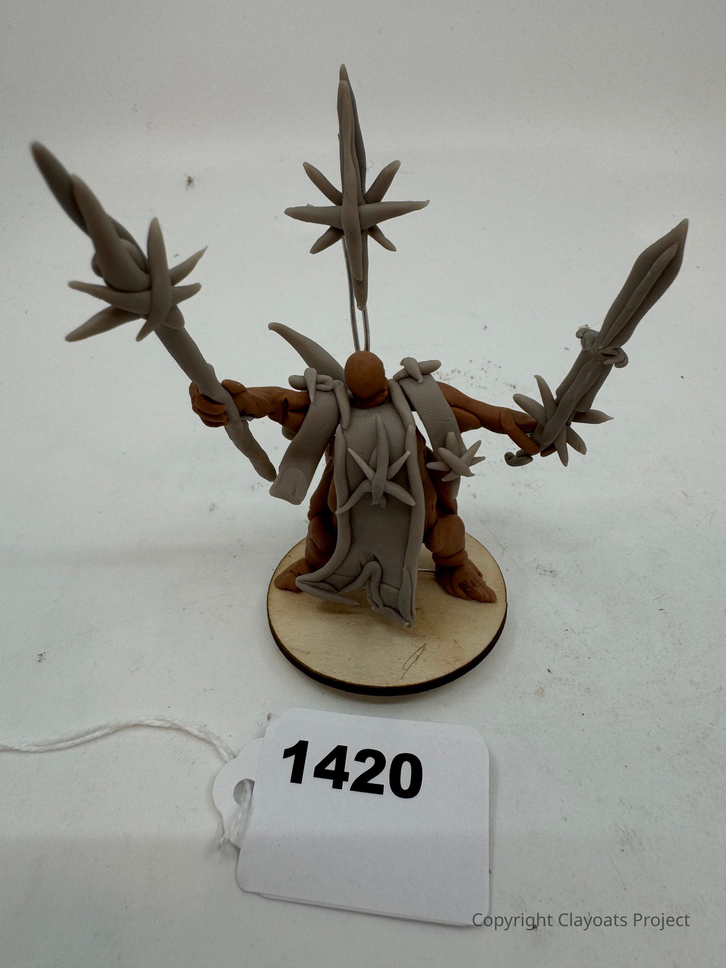 The image depicts a handcrafted clay figure standing on a circular base, adorned with intricate, spiky armor and wielding two large, star-shaped weapons in its hands. The figure seems to embody a fantasy character or warrior, with detailed craftsmanship evident in the smooth and textured parts of the sculpture. The base on which it stands is wooden, providing stability and contrast to the clay material used.