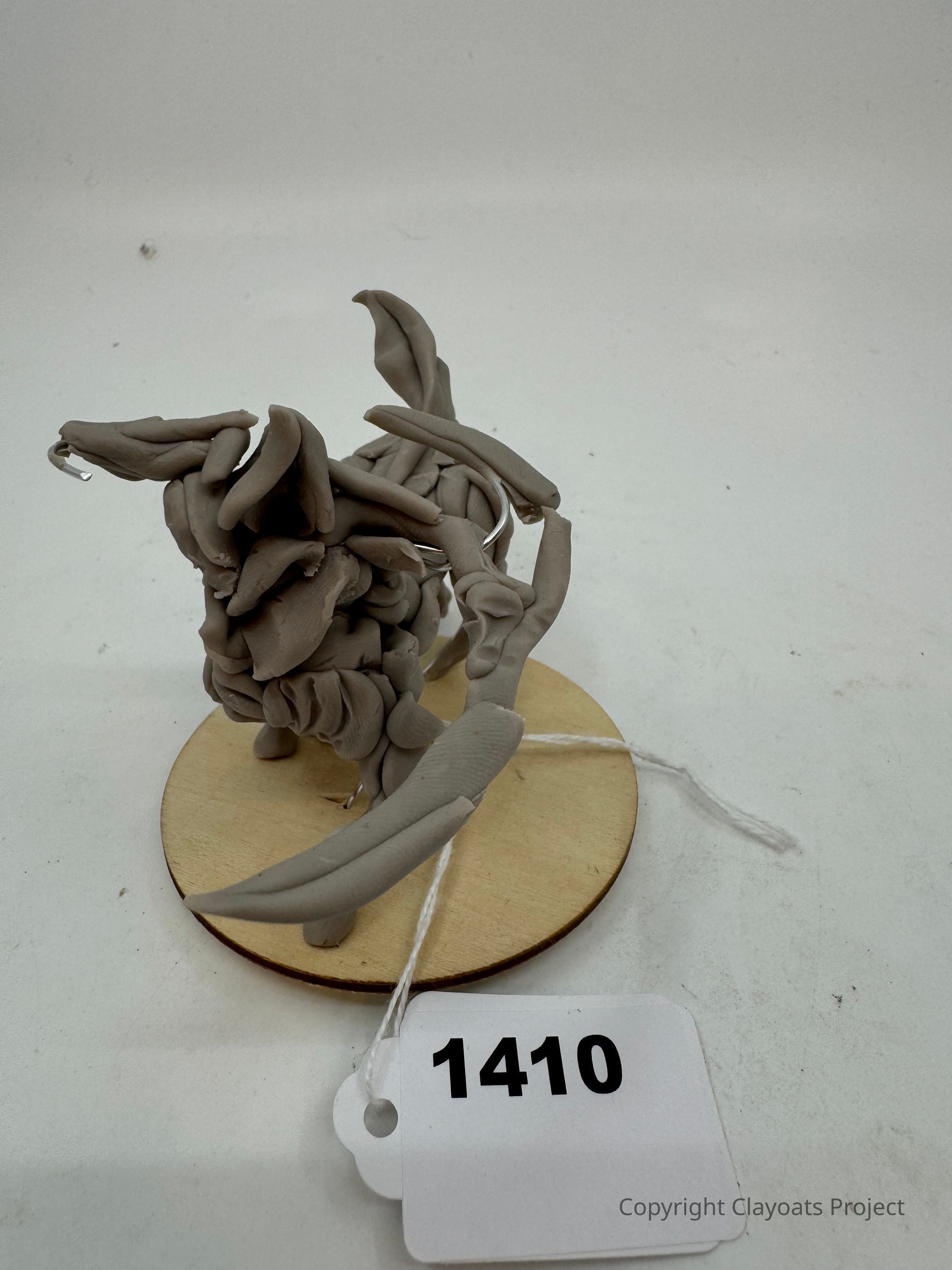 The image depicts a small, abstract gray clay sculpture sitting on a round wooden base. The sculpture appears to have several intricate folds and extensions, possibly resembling an imaginative creature or artistic form with wings or arm-like appendages. The background is plain and light-colored, highlighting the sculpture as the central focus of the image.