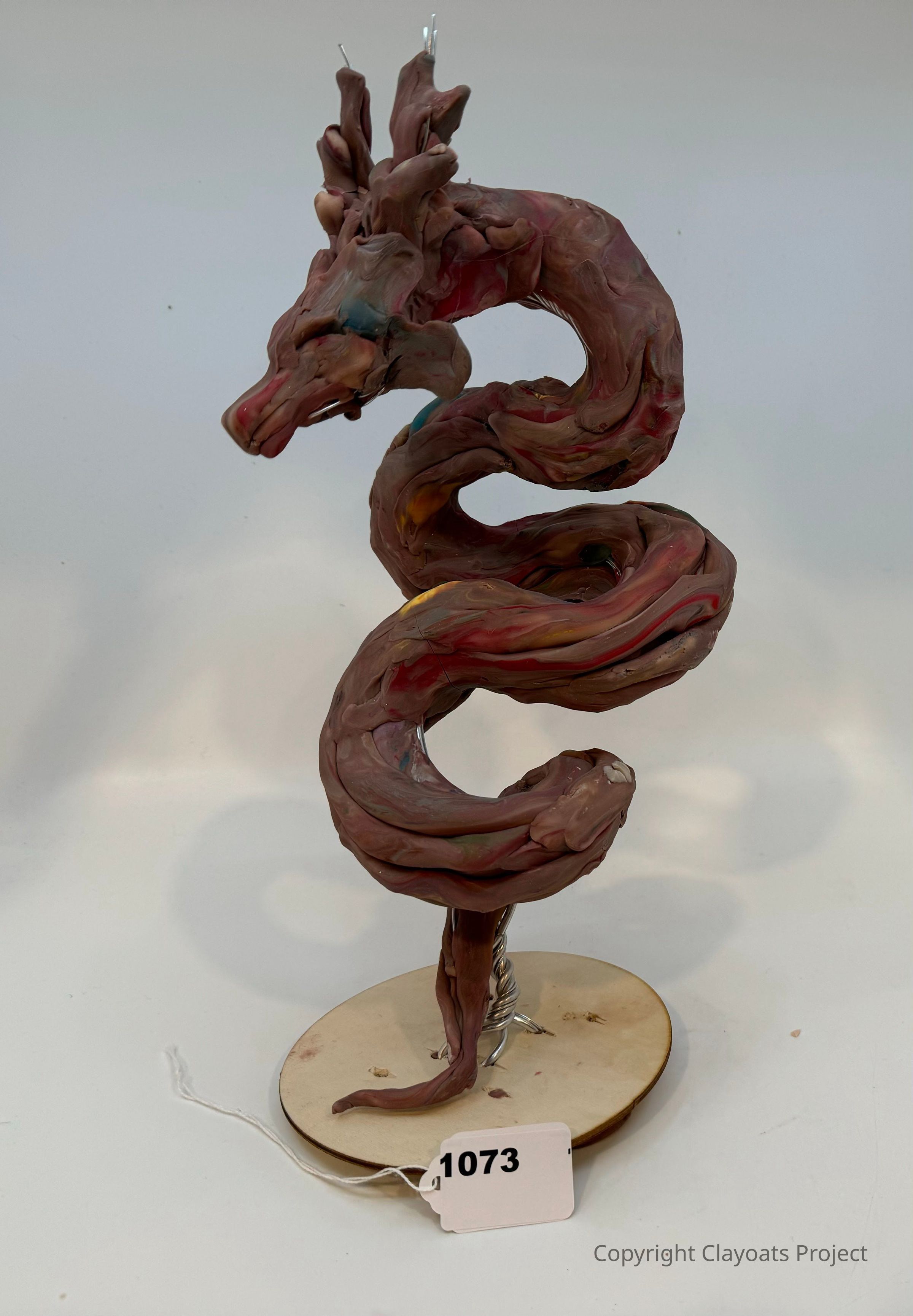 The image shows a sculpted figurine of a dragon, intricately crafted with a swirling, serpentine body and detailed head, featuring a reddish-brown color with hints of other shades; it is mounted on a circular base , and two small wires protrude from the top, all set against a neutral background, highlighting the artistry and texture of the sculpture.