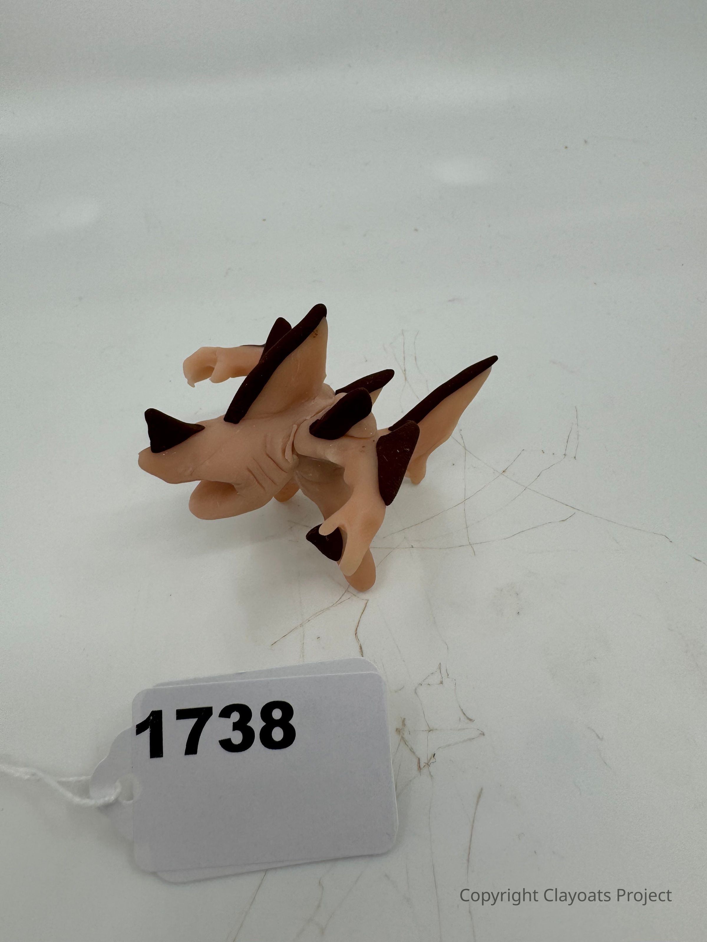 The image shows a small plastic figurine resembling a prehistoric creature or dinosaur, primarily tan in color with dark brown accents on its back and tail, placed on a flat, lightly scratched, whitish surface. The simplistic backdrop and lack of any additional items direct focus entirely on the figurine.
