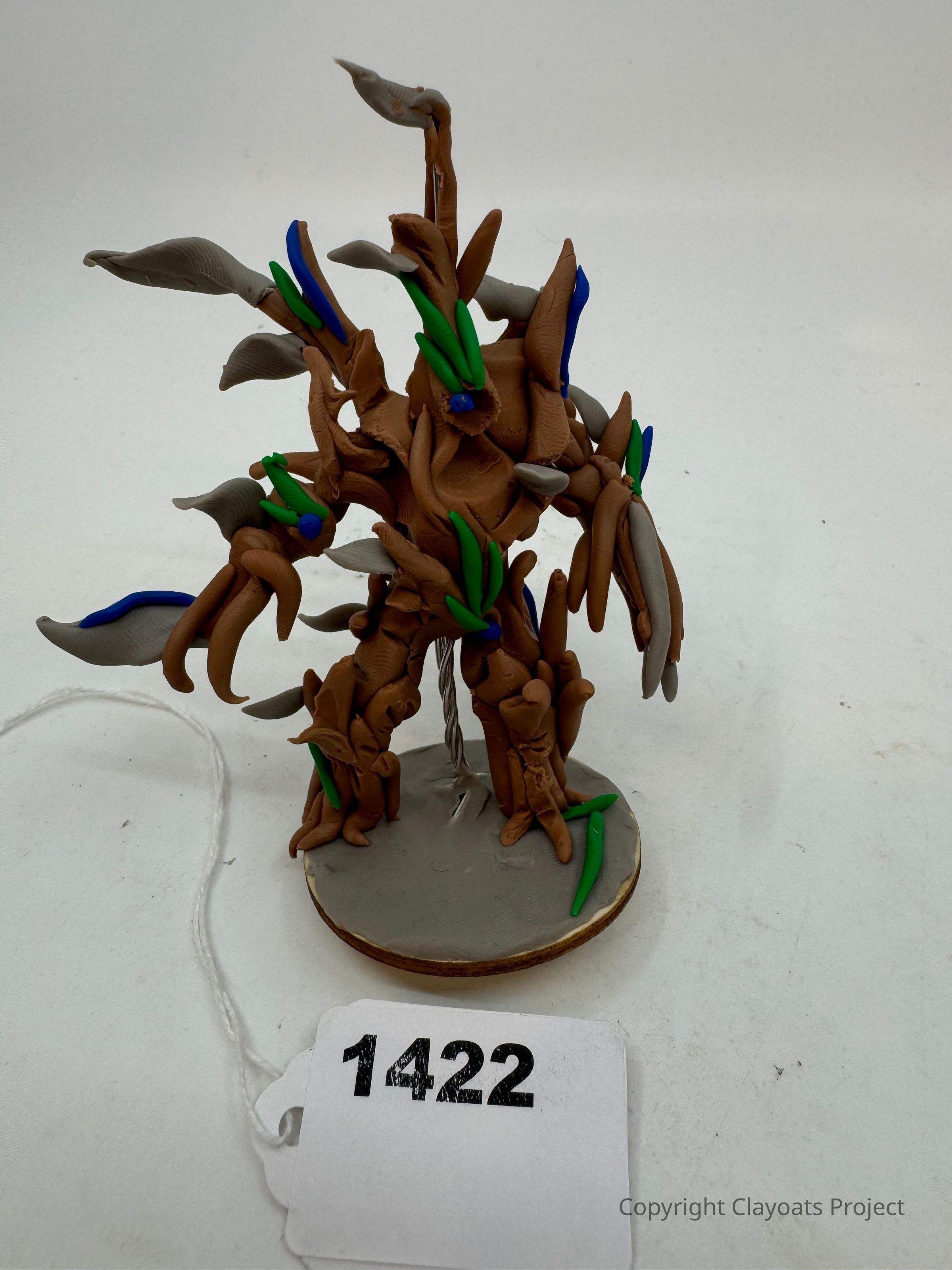 The image showcases a clay sculpture resembling a fantastical tree with twisting branches, adorned with vibrant green and blue leaf-like structures, mounted on a round gray base. The tree's intricate design features brown elements, giving it an organic and imaginative appearance, standing out against the plain white background. The sculpture appears to combine abstract and natural forms, illustrating creativity and attention to detail