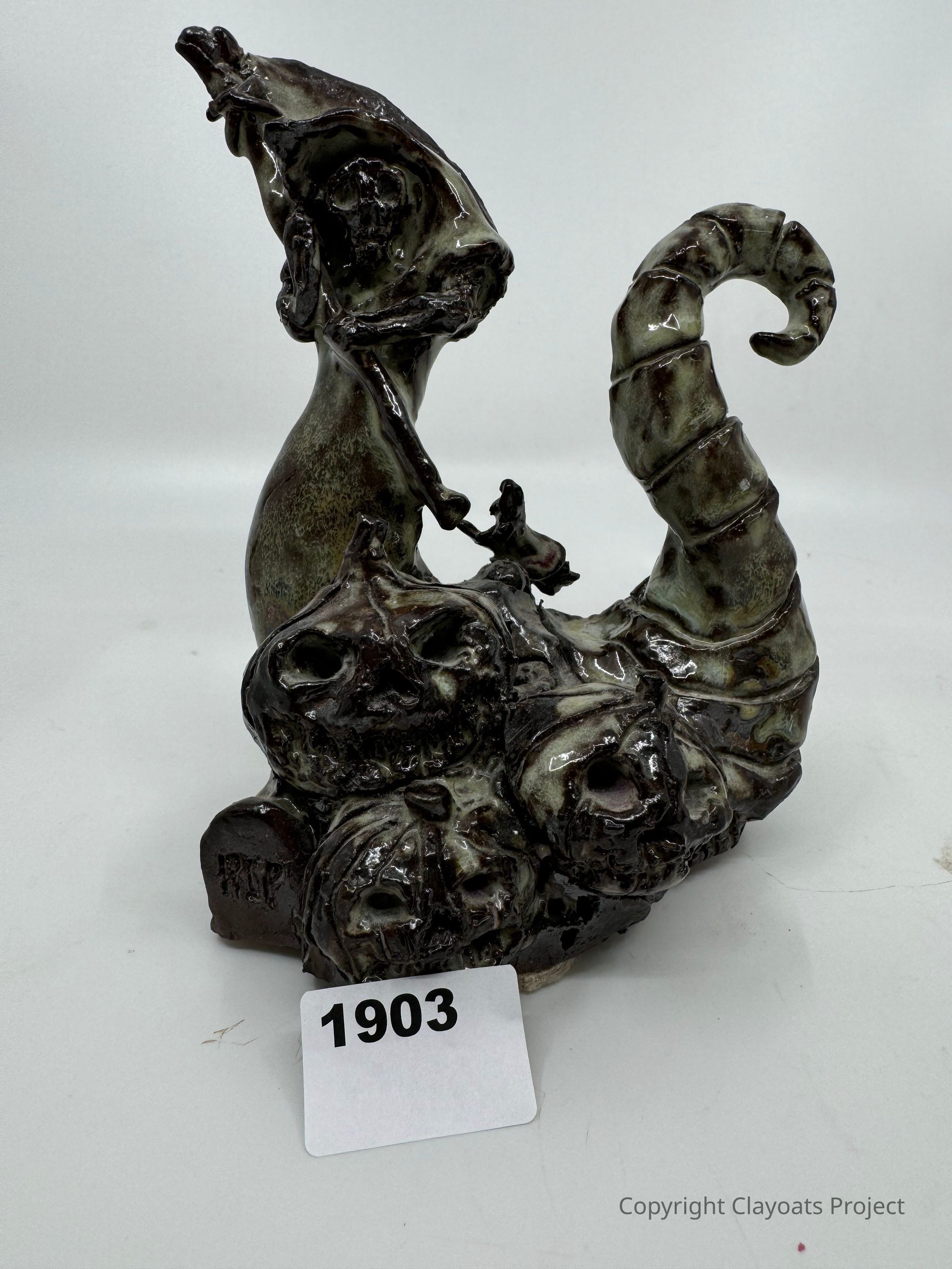 The image shows a ceramic sculpture featuring a cluster of carved pumpkins with menacing expressions, stacked on a base. A tentacle-like structure spirals upwards from the group, adding an eerie, whimsical touch. Among the pumpkins, a small tombstone with "RIP" engraved is noticeable. The sculpture has a glossy finish with shades of brown and green, enhancing its spooky theme.