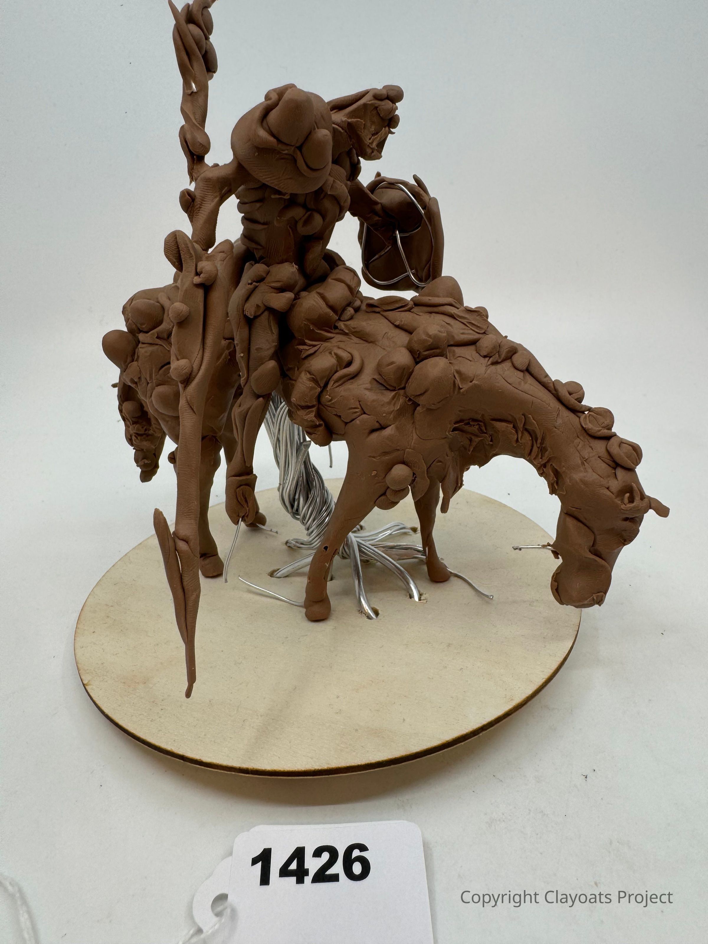The image showcases a detailed clay sculpture of a rider holding a lance while seated on a horse, atop a circular base, with visible wire elements supporting the structure; the sculpture exhibits a rugged texture, and a numbered tag labeled "1426" is placed beside it, suggesting an exhibition or cataloging context.