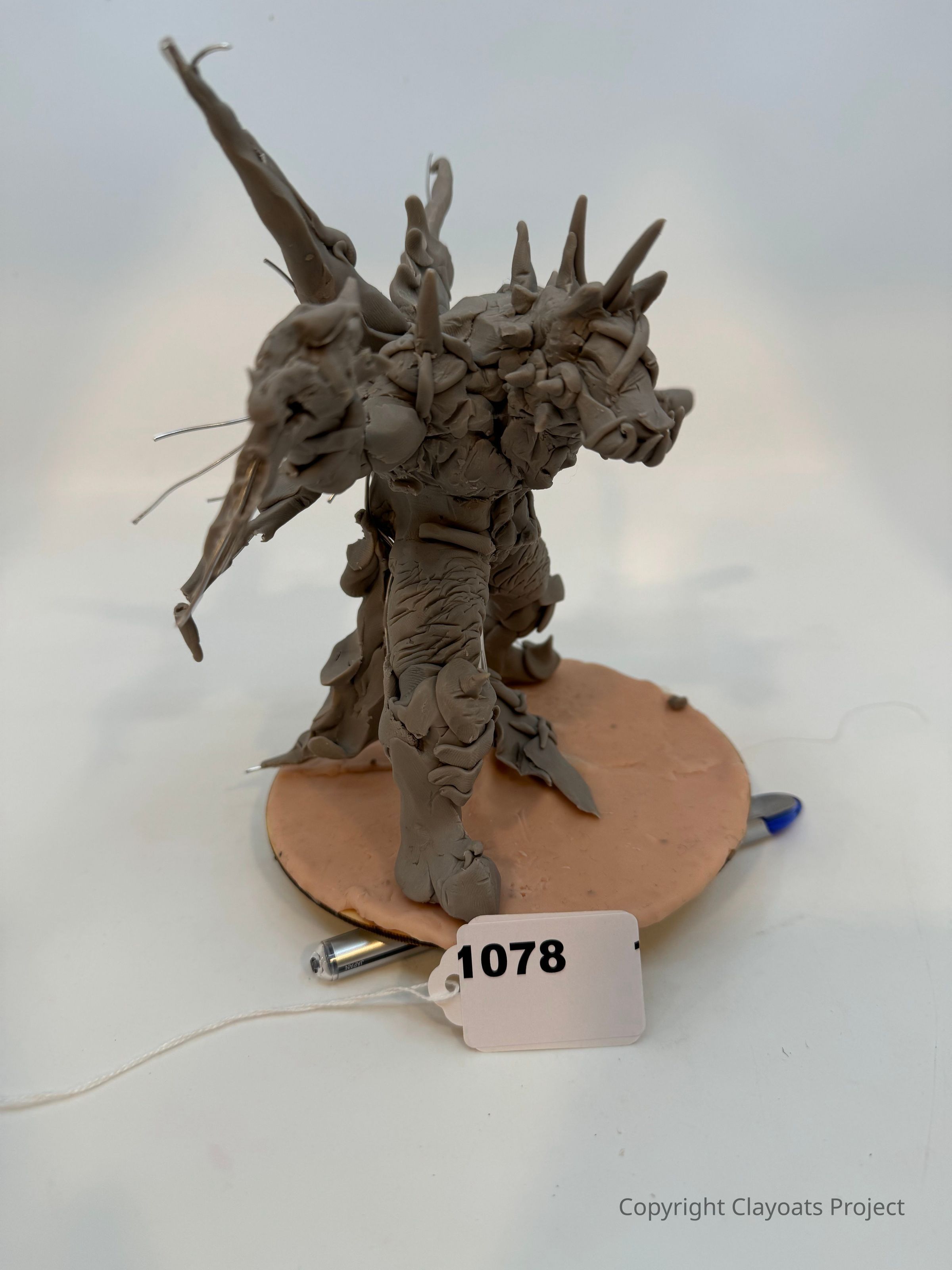 The image shows a highly detailed gray clay sculpture of a creature with numerous sharp spikes protruding from its back and head, standing on a circular base. The creature's surface is textured with intricate, organic-looking details, giving it an almost armored appearance. It has a long, protruding snout and appears to be standing on two legs. .