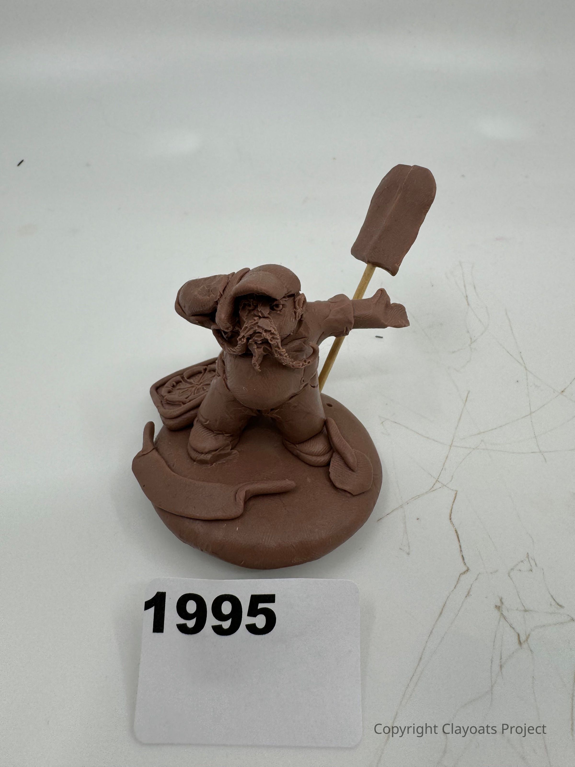 The image depicts a handcrafted clay figure of a person with a beard and cap, holding a stick with a flat, rectangular object at the end, possibly resembling a shovel. The figure stands on a circular clay base with some additional clay detailing around it. The background is a plain, light surface with faint scratches and marks, adding a subtle texture to the image, which