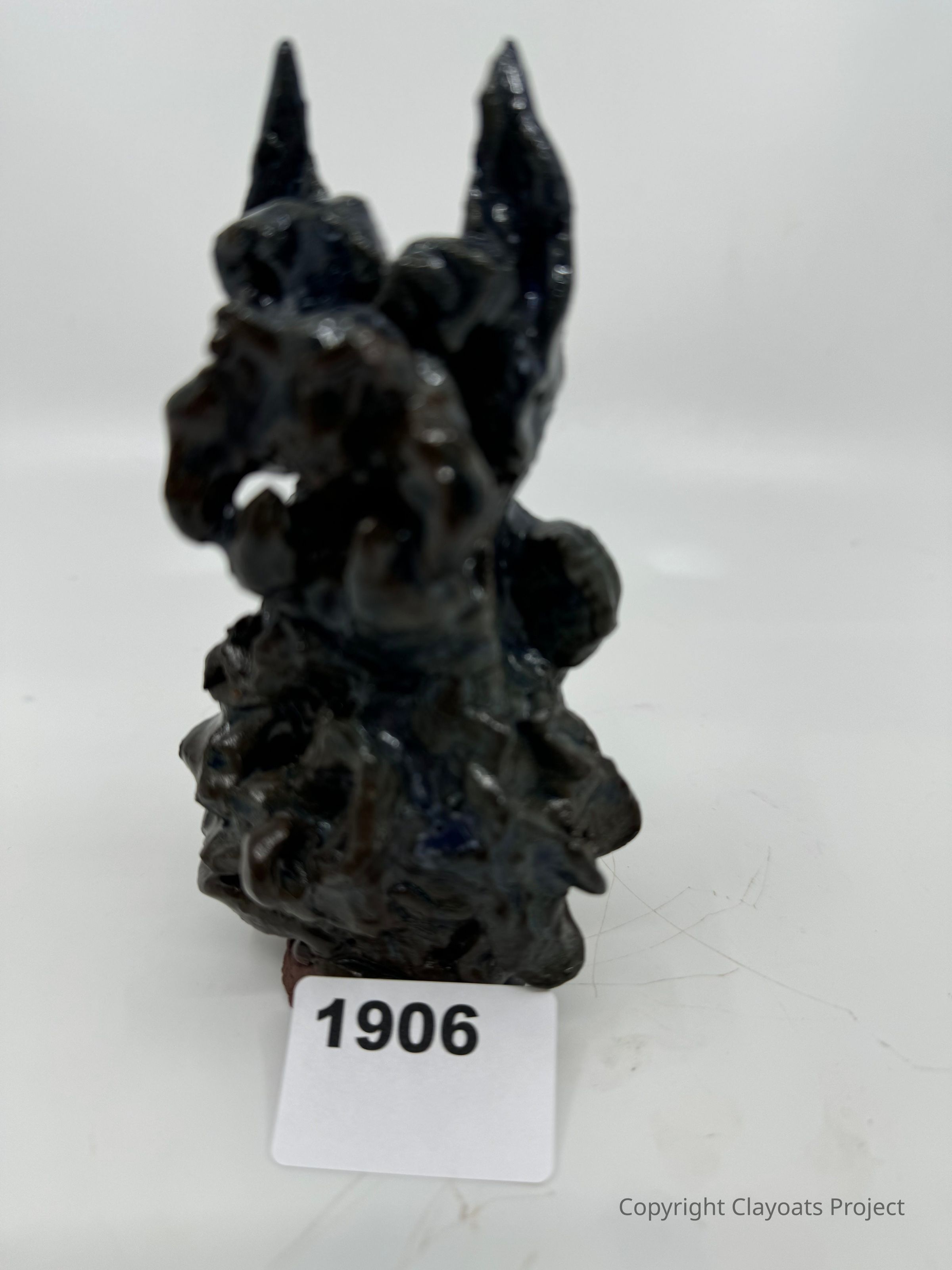 The image depicts a dark-colored, abstract sculpture with a rough texture, featuring two prominent, pointed peaks at its top, set against a neutral background. It appears to be made of glazed ceramic or a similar material. The sculpture's surface reflects light, highlighting its uneven, organic form. The piece's unique shape and finish suggest it might be part of an art exhibit or collection, and its