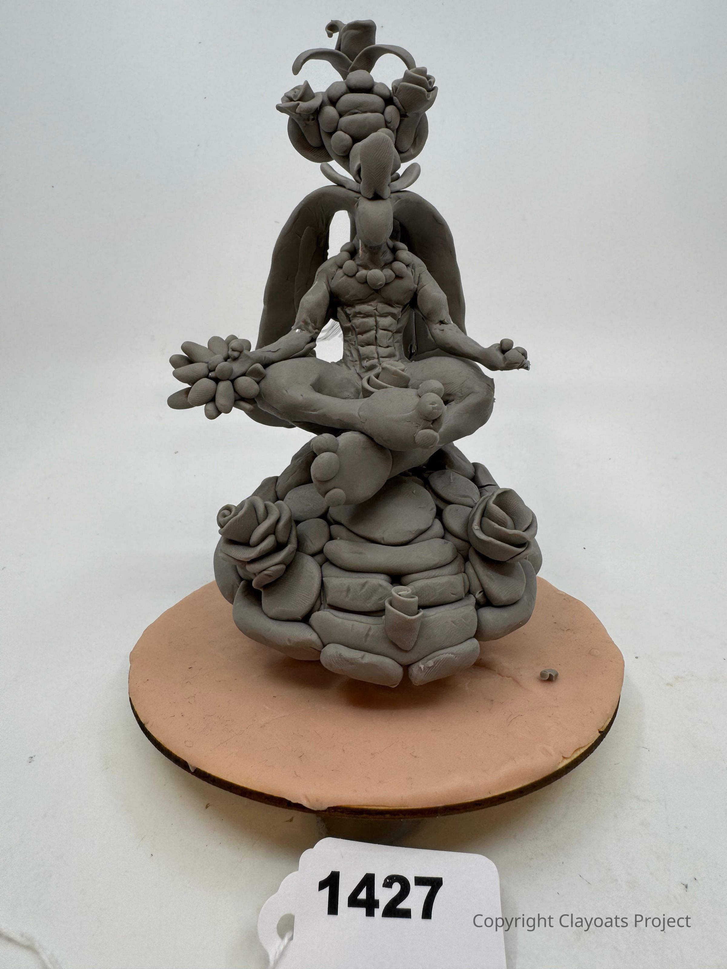 The image displays an intricately sculpted clay figure seated in a meditative pose, with detailed features including a well-defined torso, elongated fingers, and a unique headdress adorned with spherical and floral elements. The figure rests on a textured base comprising layers of circular shapes, providing a sense of stability and grounding. Positioned on a soft, circular platform.