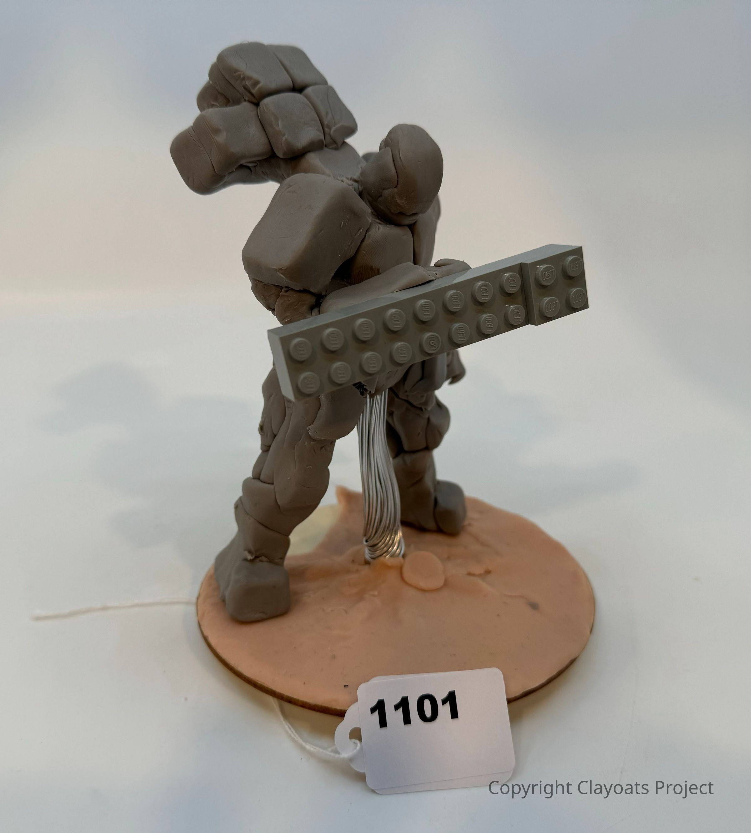 The image depicts a clay sculpture of a humanoid figure with blocky features, carrying a large, rectangular object resembling a LEGO piece. The figure stands on a circular base, which is light brown in color The sculpture's limbs are made of gray clay, with visible seams and irregular shapes that contribute to a rough, robot-like appearance. Behind the figure, a bundle of metallic wires extends from the base.