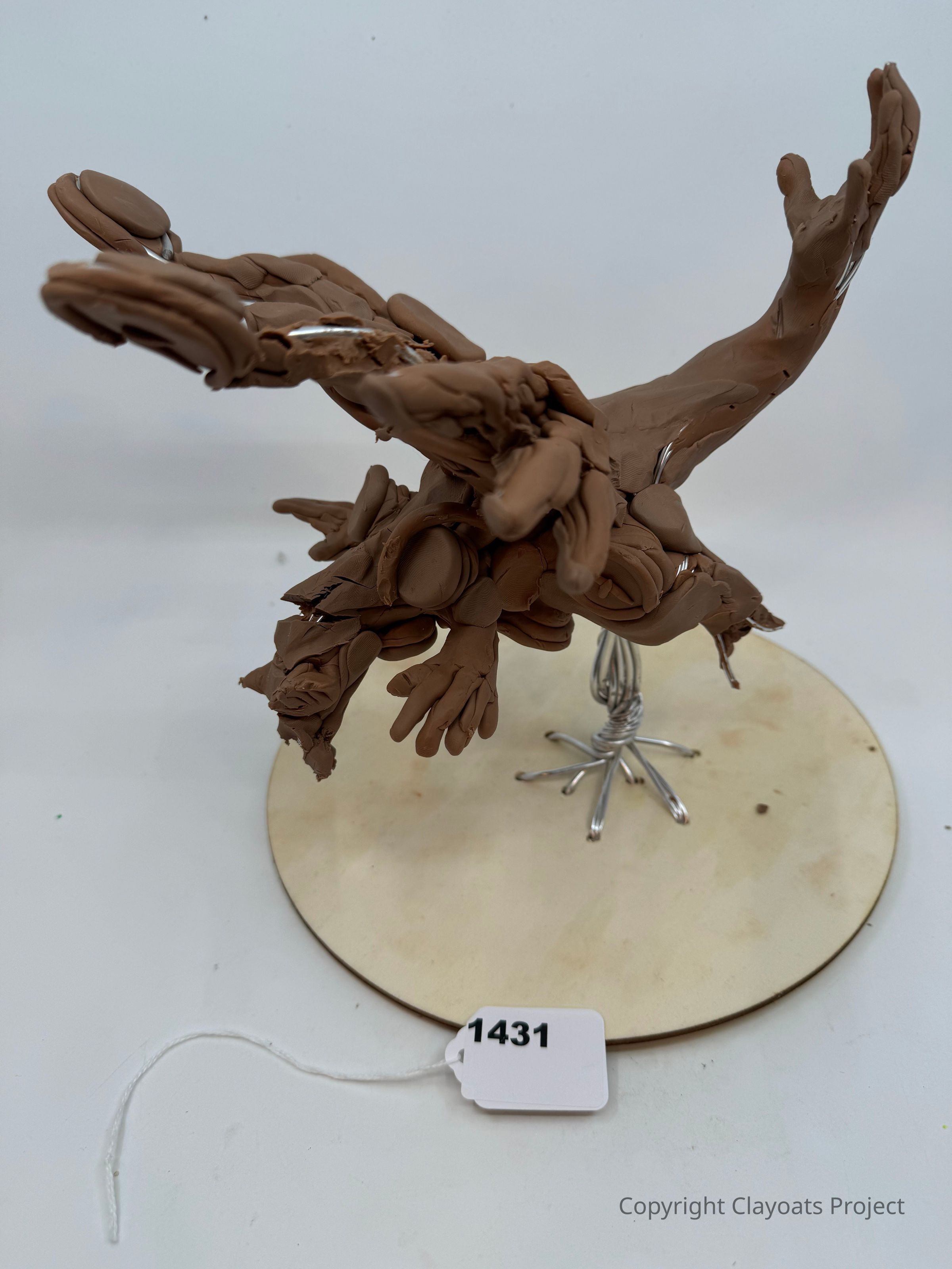 The image depicts a sculpture made of clay and metal wire, featuring a dynamic and abstract design resembling intertwined hands and limbs, all mounted on a circular wooden base.The sculpture's organic forms and textures create a sense of movement and complexity, contrasting with the simplicity of the base and tag. The piece is against a plain background, emphasizing the intricate details and craftsmanship in the sculptural work.