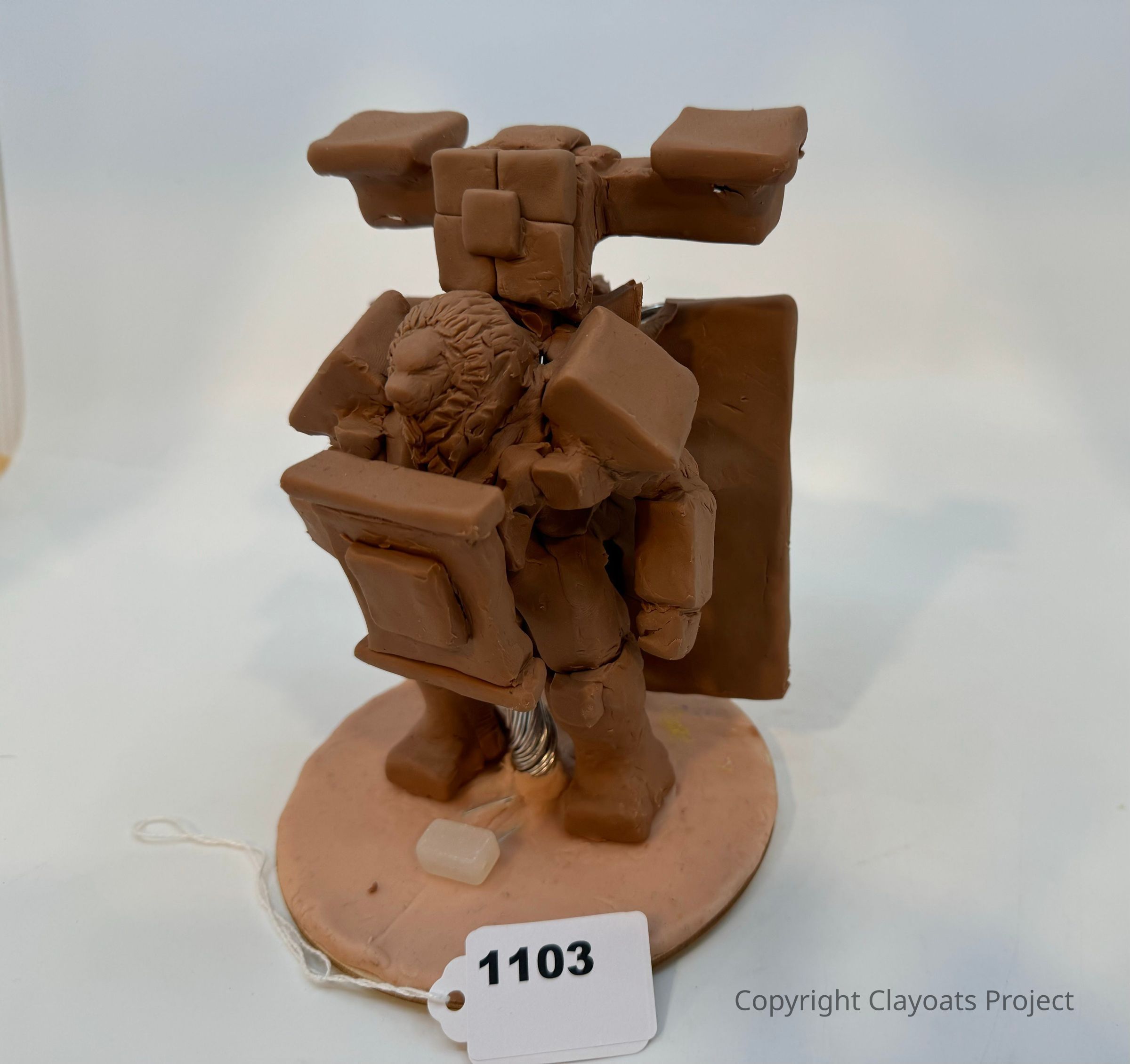 The image showcases a small clay sculpture resembling a blocky humanoid figure, featuring square and rectangular shapes to form its head, arms, and torso. It stands on a circular base with a visible coiled wire structure beneath it. The sculpture appears to have a rough texture, indicating it may be hand-molded.
