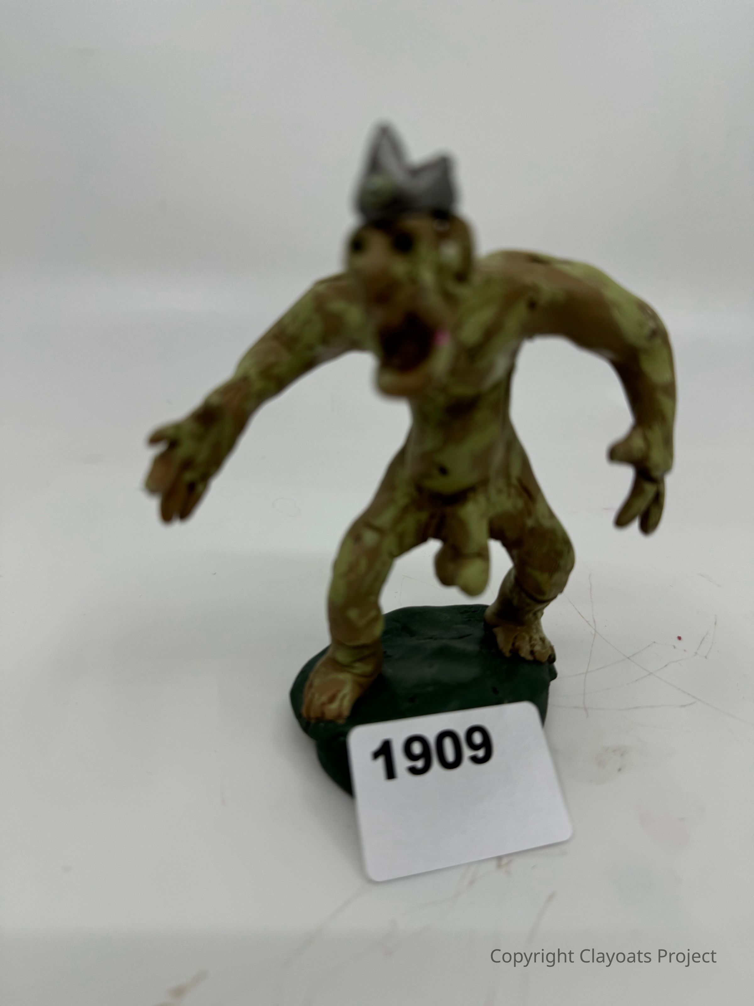 The image depicts a figurine resembling a troll or goblin creature with outstretched arms, a menacing expression, and a pointed hat, standing on a circular base the background is a plain white surface, providing clear contrast to the earthy tones of the figurine.