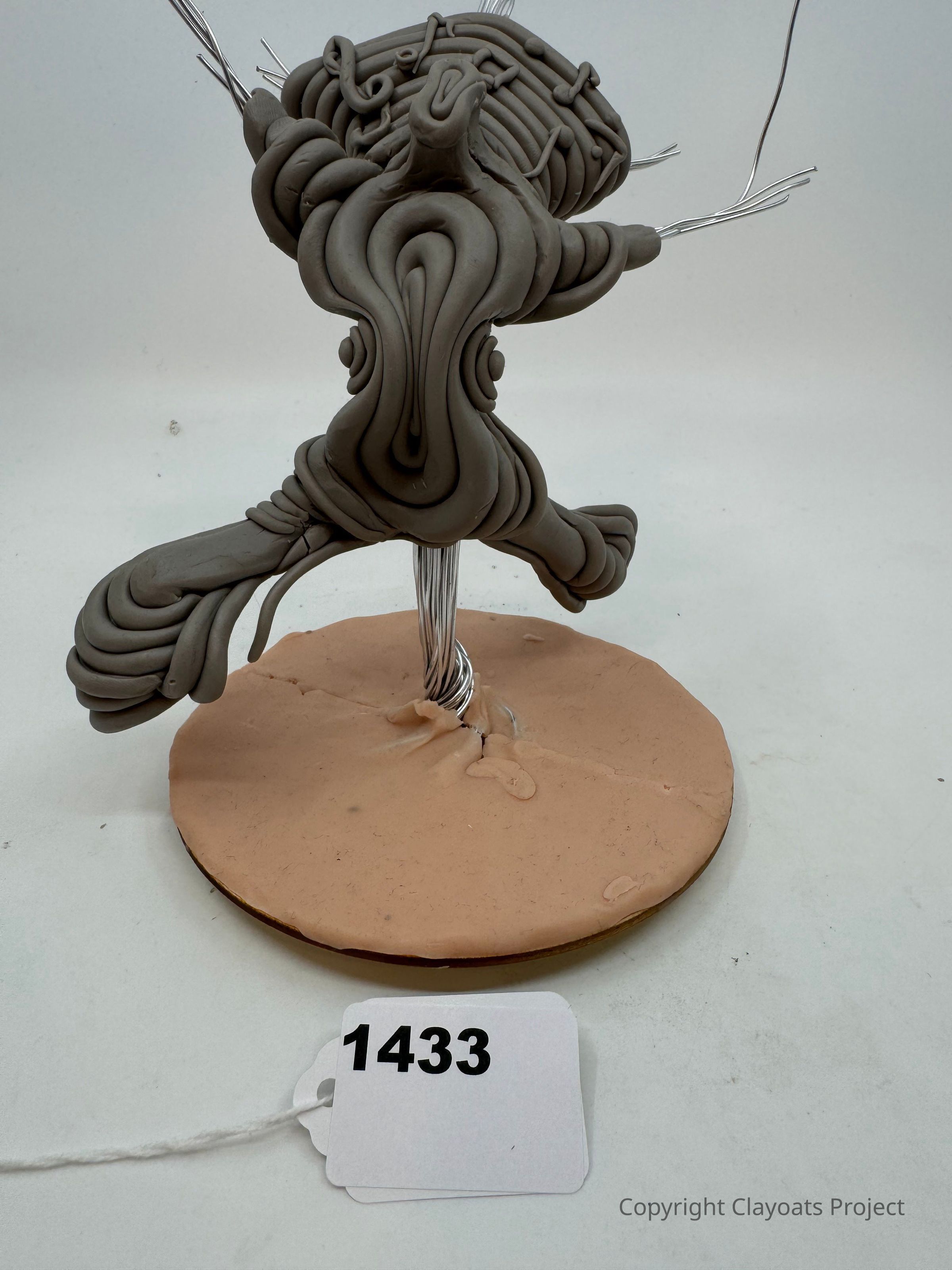 The image features a small sculptural artwork made of gray clay and wire, creatively shaped into an abstract form with intricate, swirling patterns and curved lines, giving it a dynamic, textured appearance. The piece is mounted on a flat, round base, which appears to be coated with a beige material, possibly clay or similar substance, to provide stability to the structure.