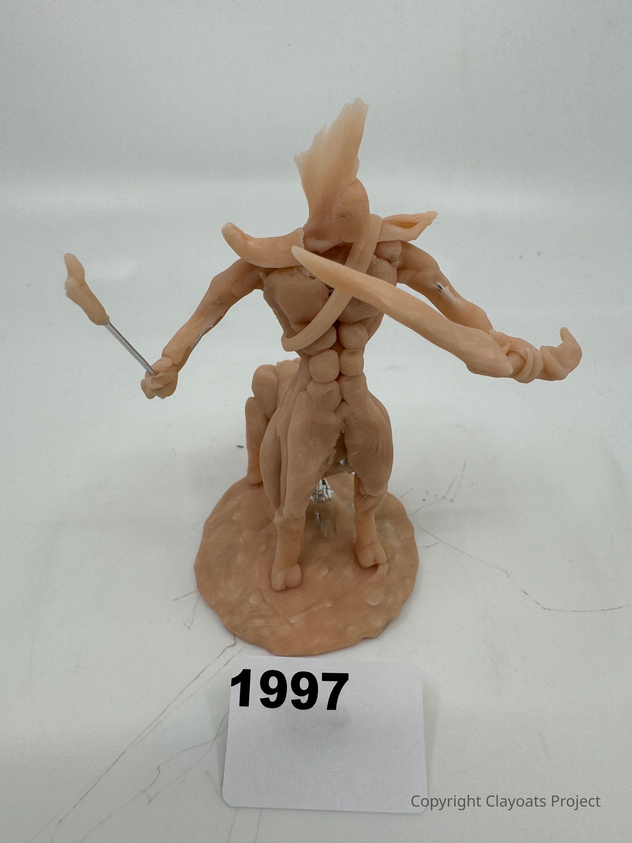 The image depicts a sculpted figure resembling a mythical centaur-like creature standing on a circular base, with an upright posture and muscular body. It has a distinct headpiece or crest, and holds long, thin rods or weapons in both hands, suggesting readiness or action. The sculpture appears to be made from a clay or wax-like material with a beige hue, displaying intricate detail in the depiction of muscles and limbs.