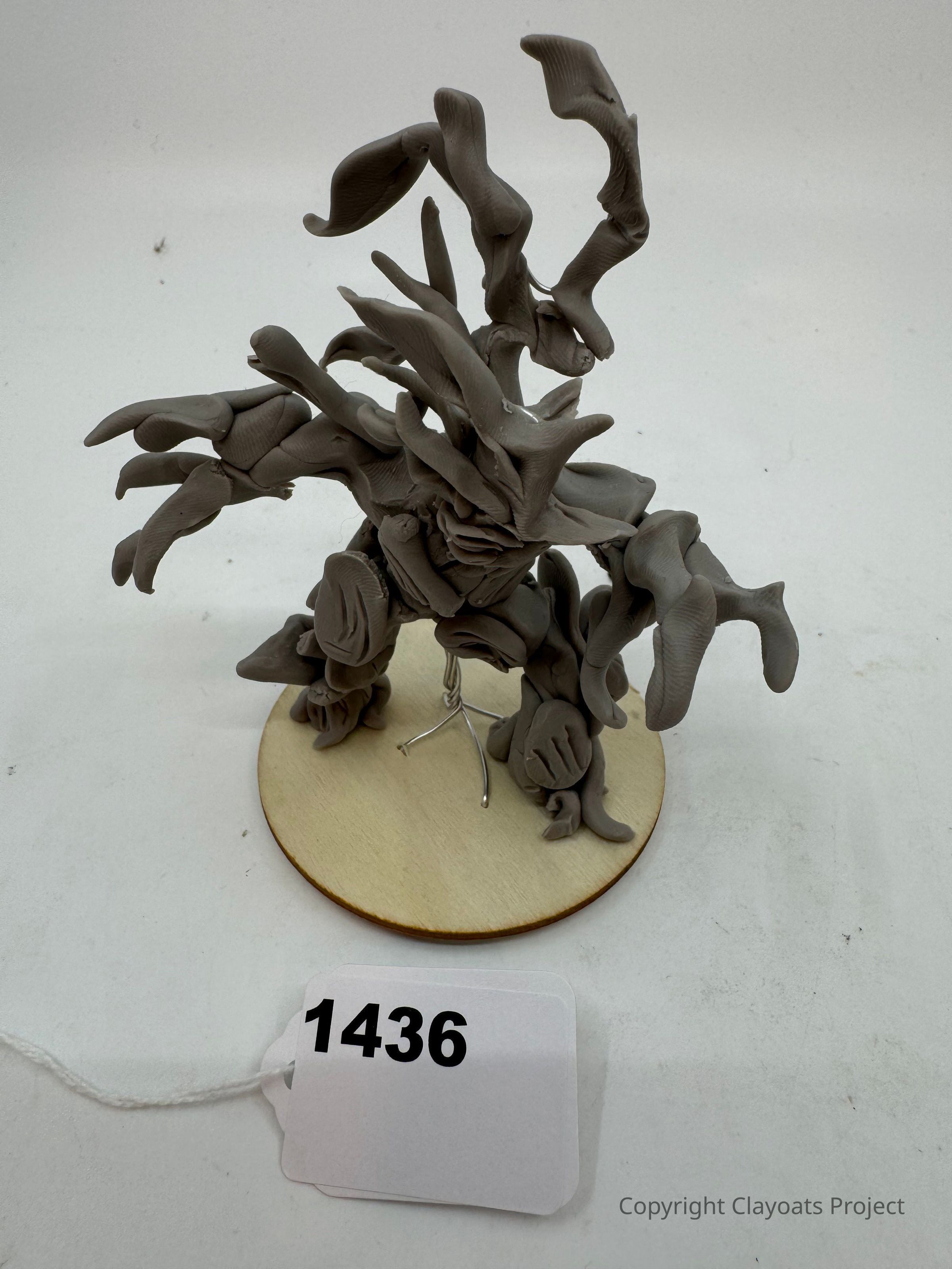 The image depicts a creatively sculpted figure made of a clay-like material, exhibiting an abstract form with flowing, organic extensions resembling branches or vines, positioned on a light wooden base. . Its unique and imaginative design evokes a sense of movement and nature, highlighting the artist’s skill in transforming simple materials into an intricate work of art, capturing attention through its dynamic