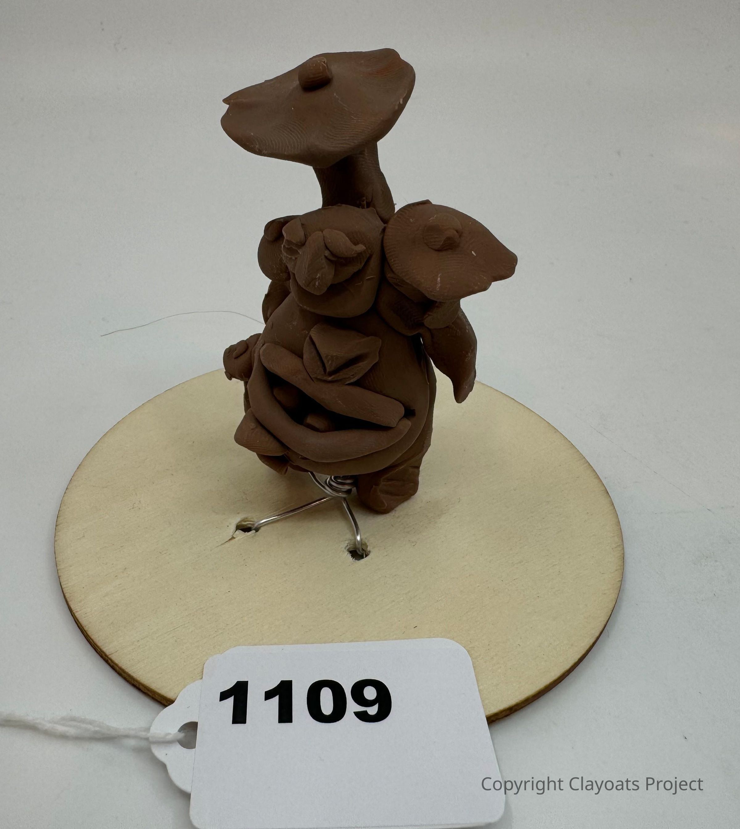 The image showcases a brown clay sculpture featuring abstract shapes resembling mushrooms and organic forms, placed on a circular wooden base with metal support.