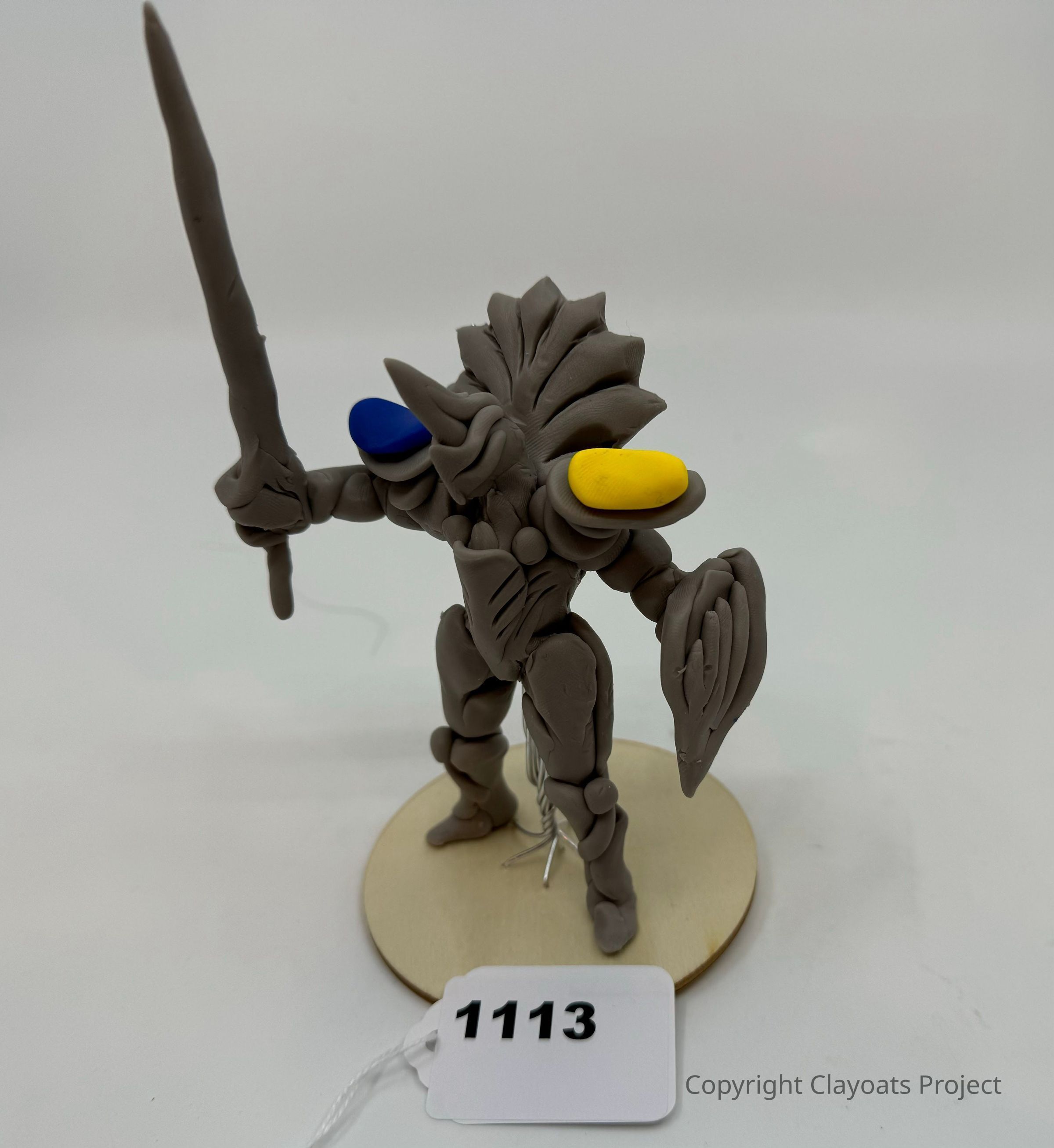 The image depicts a gray clay statue of a humanoid figure holding a long sword-like weapon, with elaborate features resembling armor or a robotic design; it has blue and yellow circular accents on its shoulders, possibly representing digital eyes or decorative elements. The figure stands firmly on a round wooden base, supported by a thin wire, adding stability.