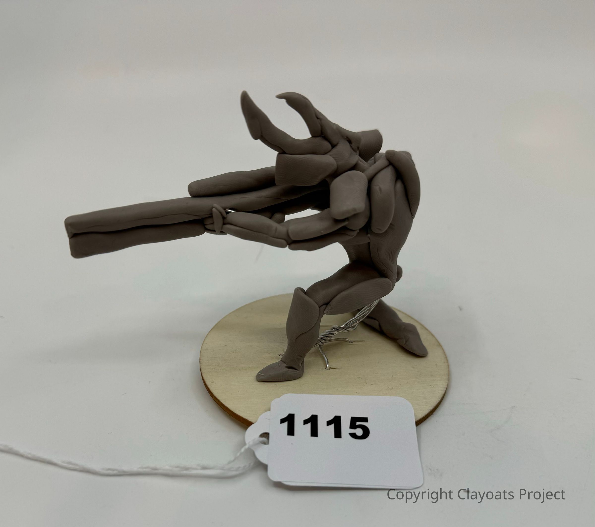 The image features a unique clay sculpture of a humanoid figure with elongated limbs, poised as if holding a weapon, and positioned on a circular wooden base, displaying attention to detail in its abstract form; all against a plain background that highlights the intricate craftsmanship and unusual design of the artistic creation.