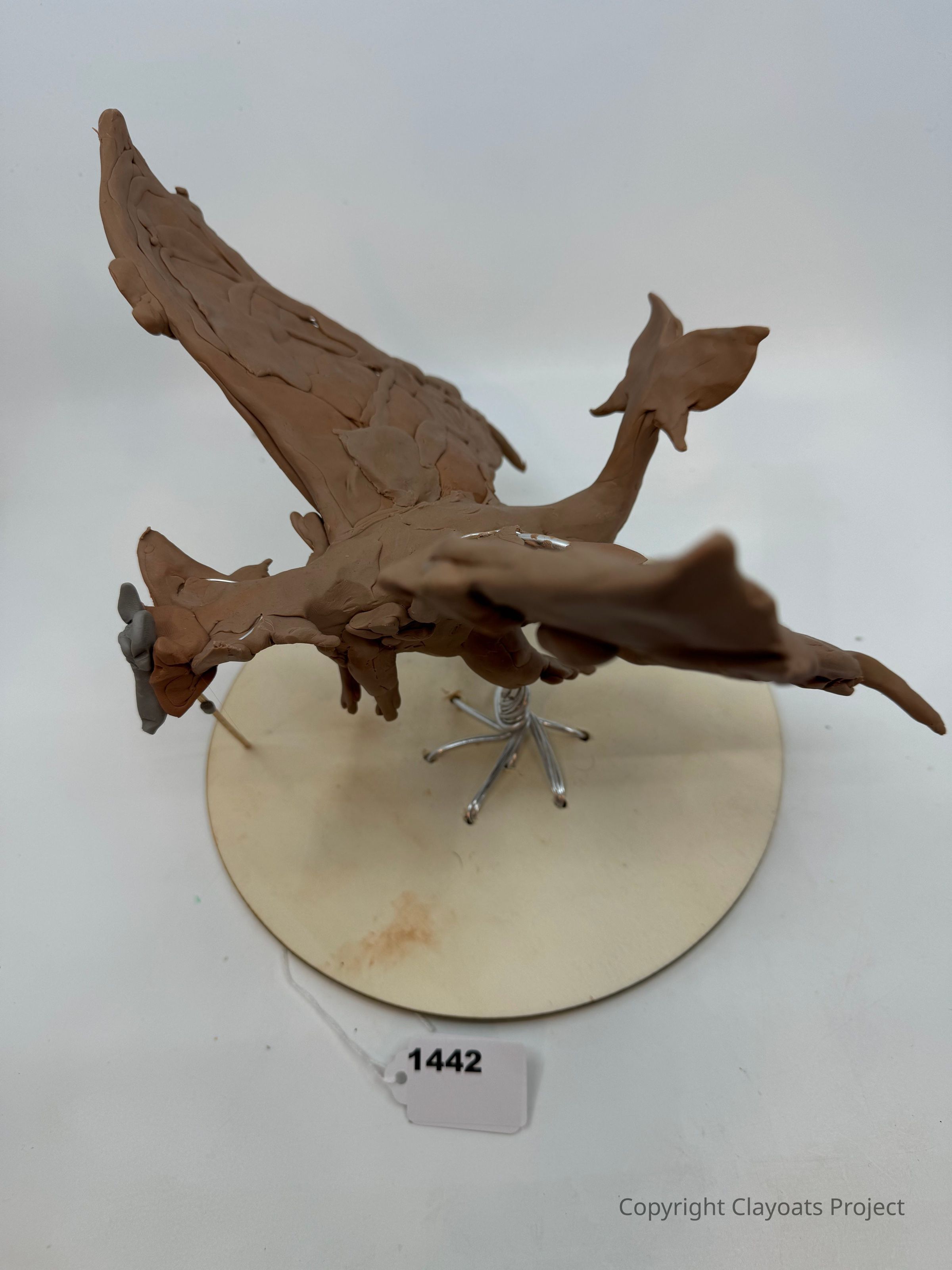 The image depicts a clay sculpture of a bird-like creature with outstretched wings, perched on a metal stand atop a circular base, showcasing detailed textures and contours, evoking a sense of motion as if the creature is about to take flight; the brown, earthy tones of the sculpture contrast with the plain white background, drawing attention to its intricate craftsmanship.