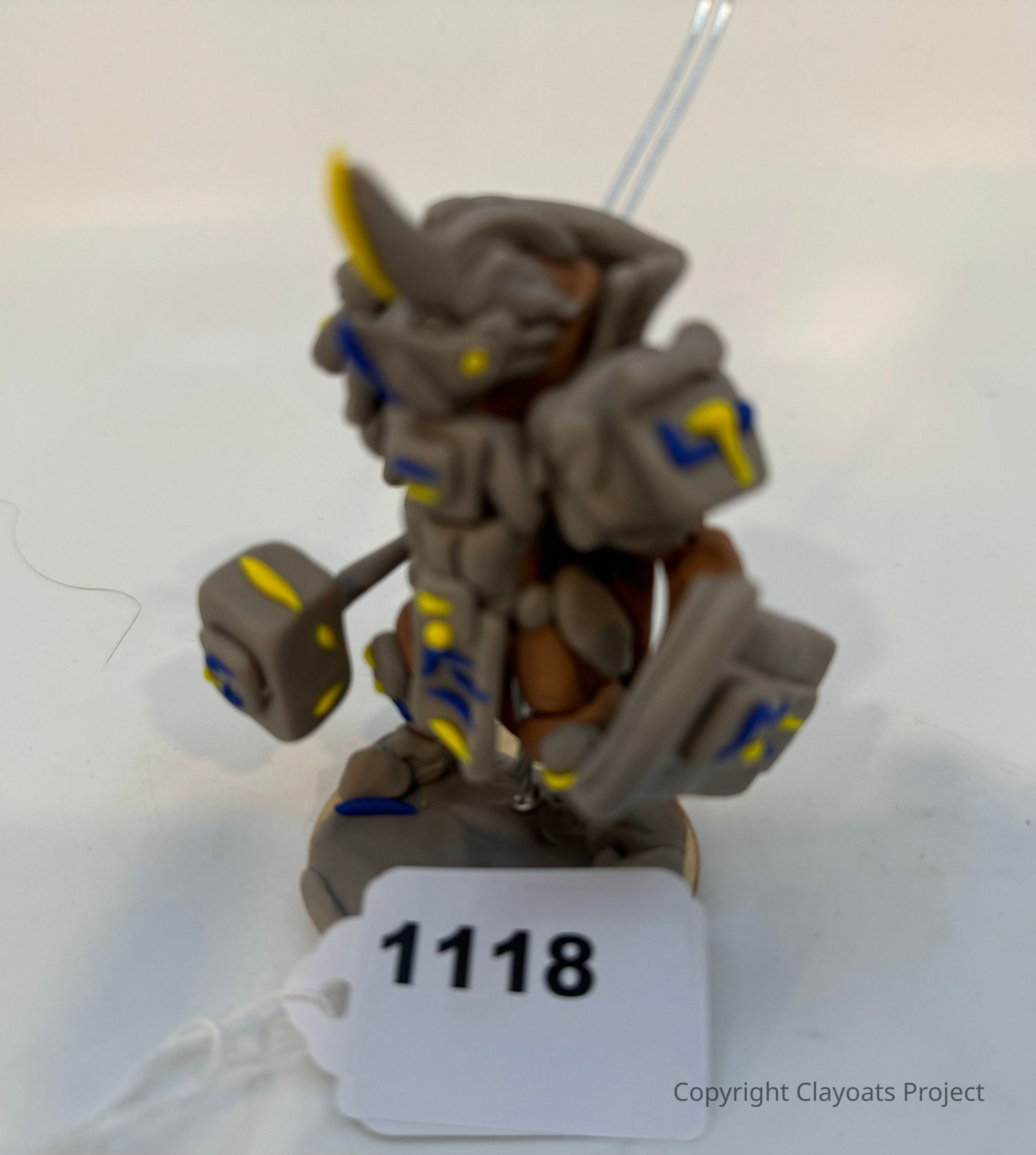 The image shows a small, detailed figurine of a robotic-like creature with distinctive armor-like elements, including a prominent horn on its head and angular decorations in blue and yellow accents on a gray base. The figure is positioned on a small stand, which appears to be part of its design, adding to its stability and display appeal.