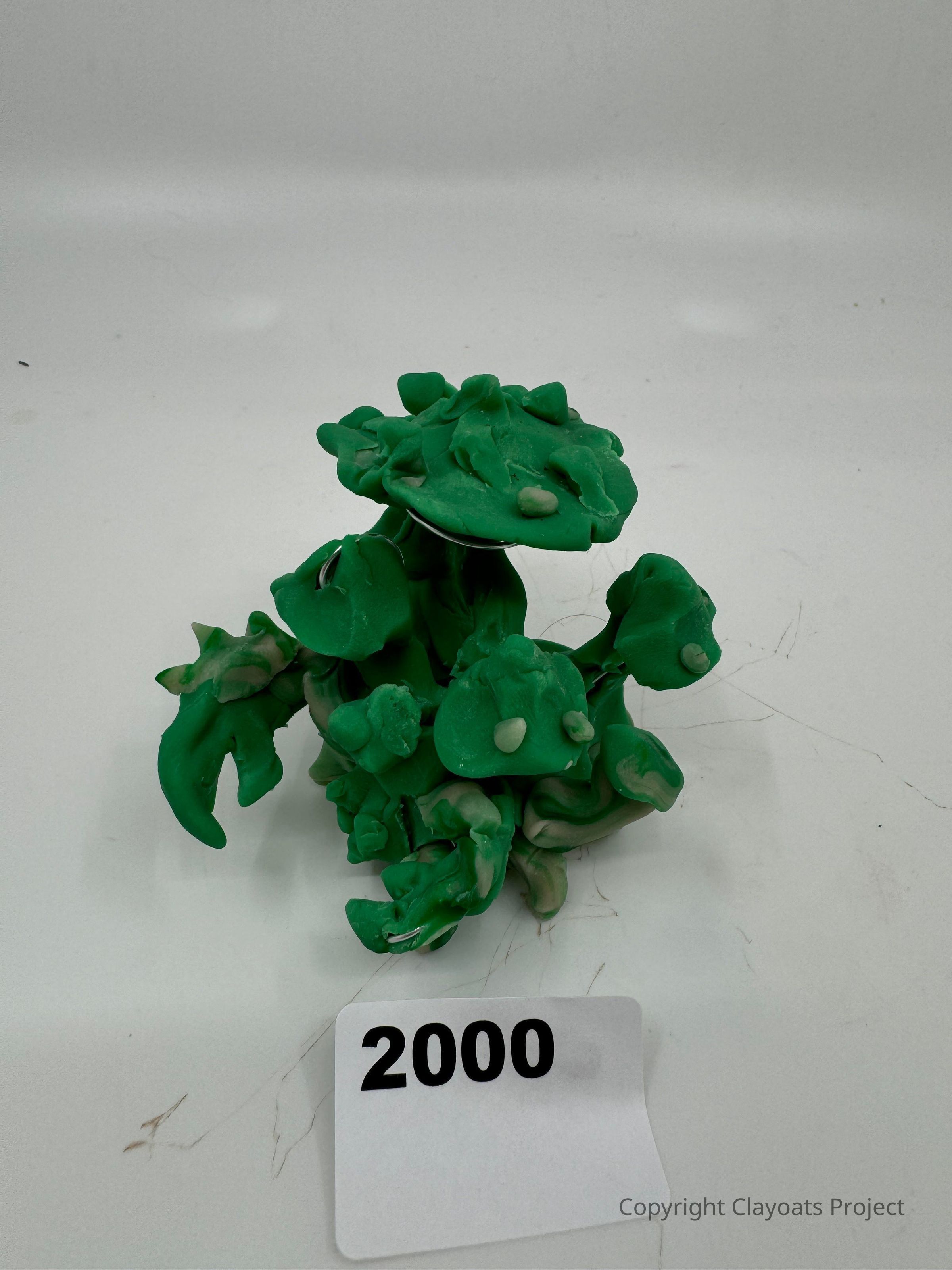 The image depicts a small, abstract sculpture made of green clay, creatively shaped with various curves and textures, placed on a white surface. The clay's organic form appears to twist and intertwine, creating an intriguing visual with subtle variations in shade and texture, drawing the viewer's attention to the intricacy of the handmade piece against the simple backdrop.