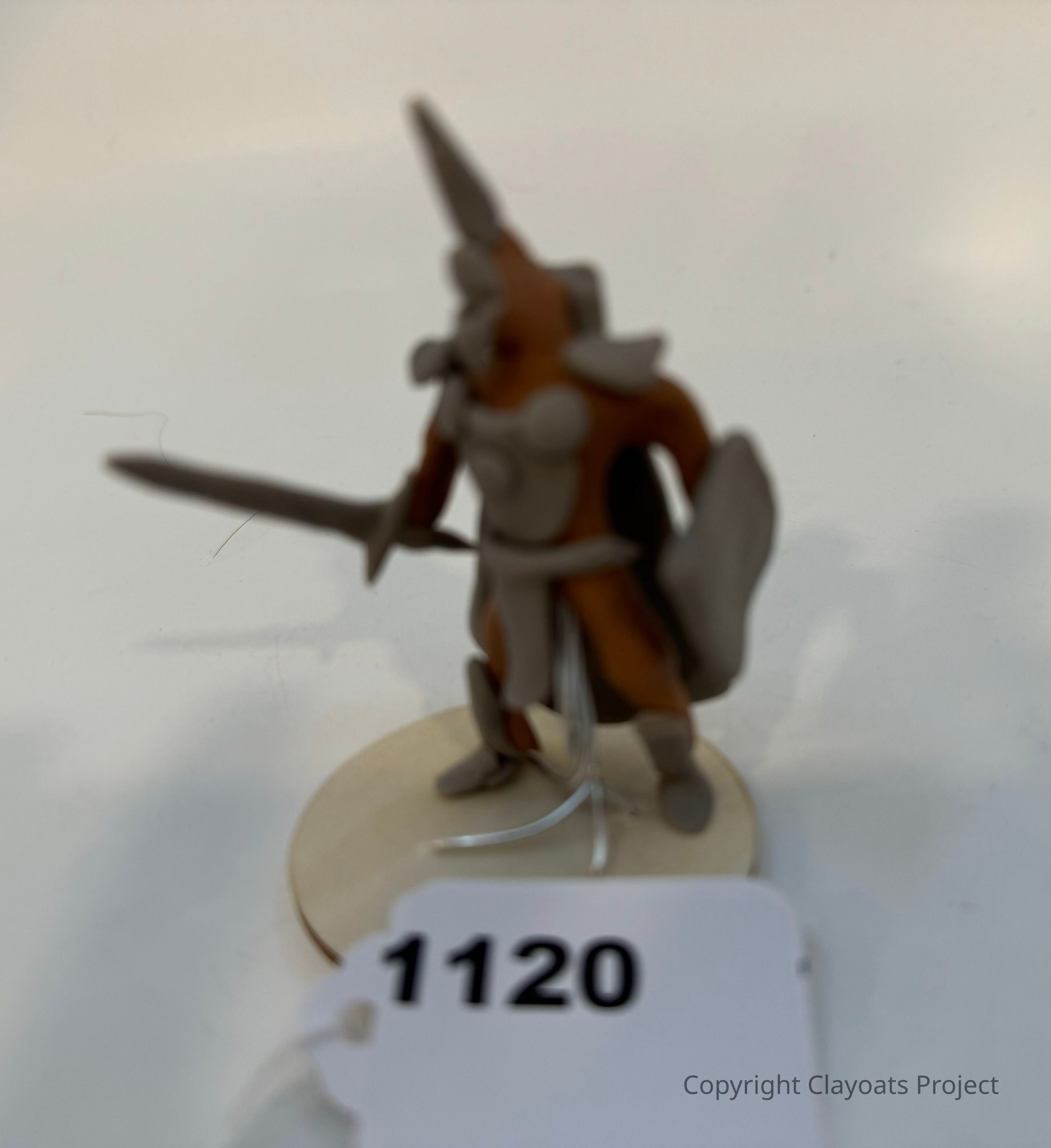 The image shows a small figurine of a warrior, holding a sword in one hand and a shield in the other, standing on a circular base. The warrior features a pointed helmet and armor typical of medieval or fantasy styles, with a combination of brown and gray colors. The image is slightly out of focus, giving it a soft appearance, and the background is plain and light-colored, emphasizing the figure