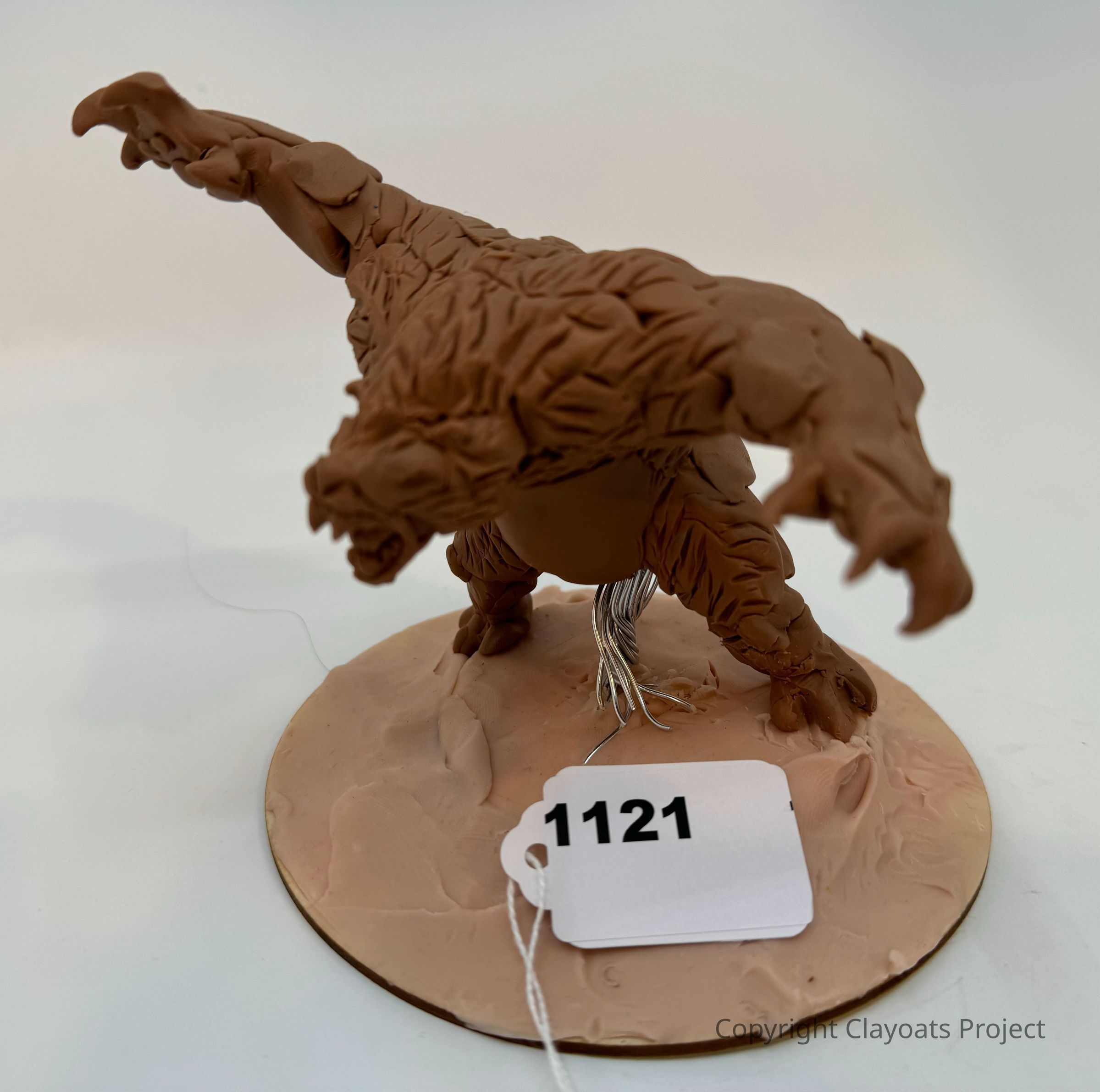 The image shows a detailed sculpture of a fierce creature, possibly a monster or fantasy beast, crafted from a brown clay-like material. It stands on a round base with texture resembling terrain, giving an impression of movement or readiness. The sculpture has sharp claws, a menacing expression, and muscular features. Attached to the base is a white tag marked with the number "1121," suggesting it might be part of a collection or cataloged for display. The creature’s stance and detailed texture highlight the artist