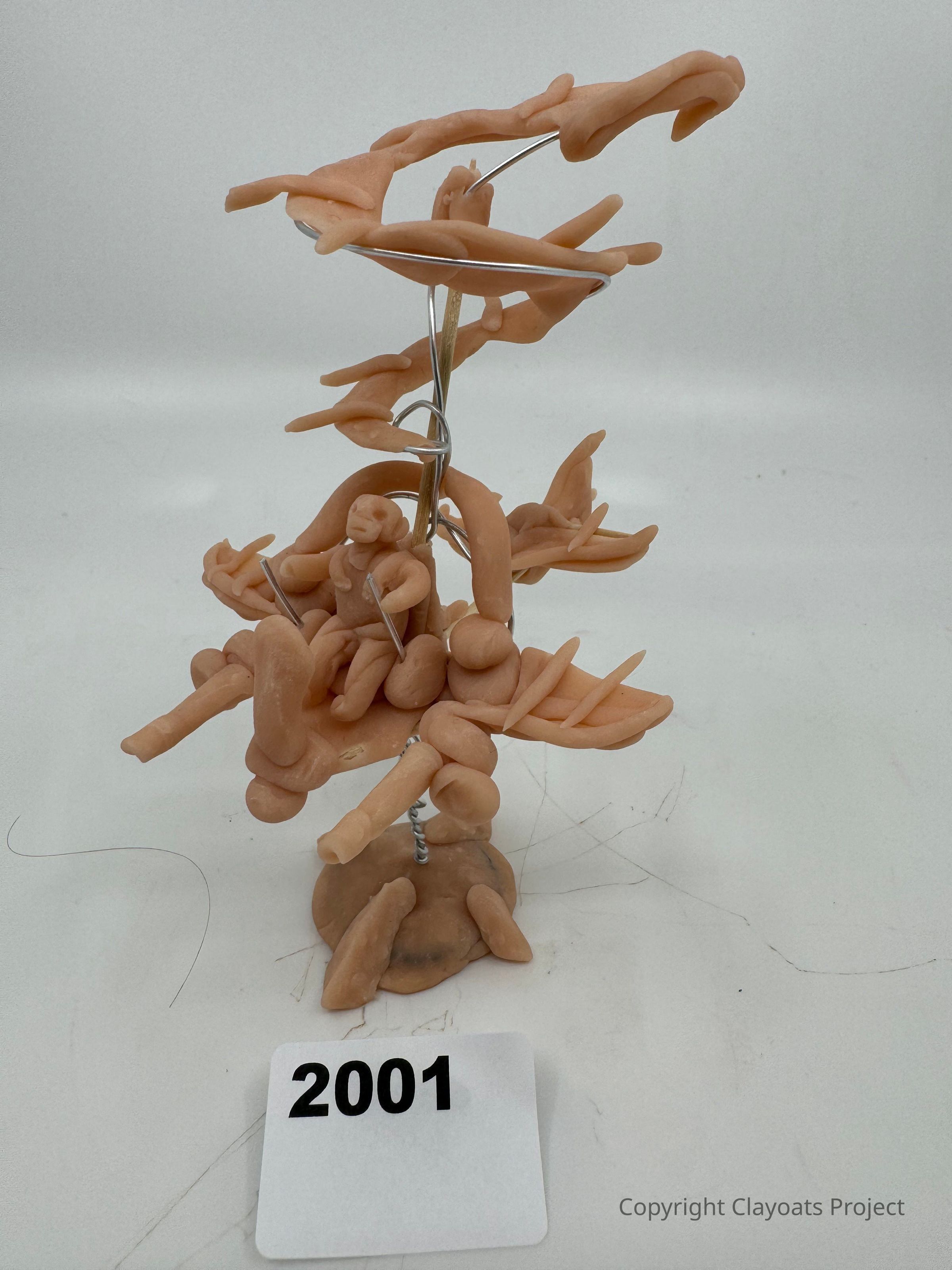 The image depicts an abstract sculpture made of clay and wire, featuring a complex arrangement of twisted, elongated clay figures resembling branches, supported by visible wire scaffolding, all resting on a clay base. Intricate organic forms intertwine together, suggesting movement or growth within its creative design, with the neutral background emphasizing the sculpture's unique structure and artistry, creating an intriguing visual experience that invites various interpretations