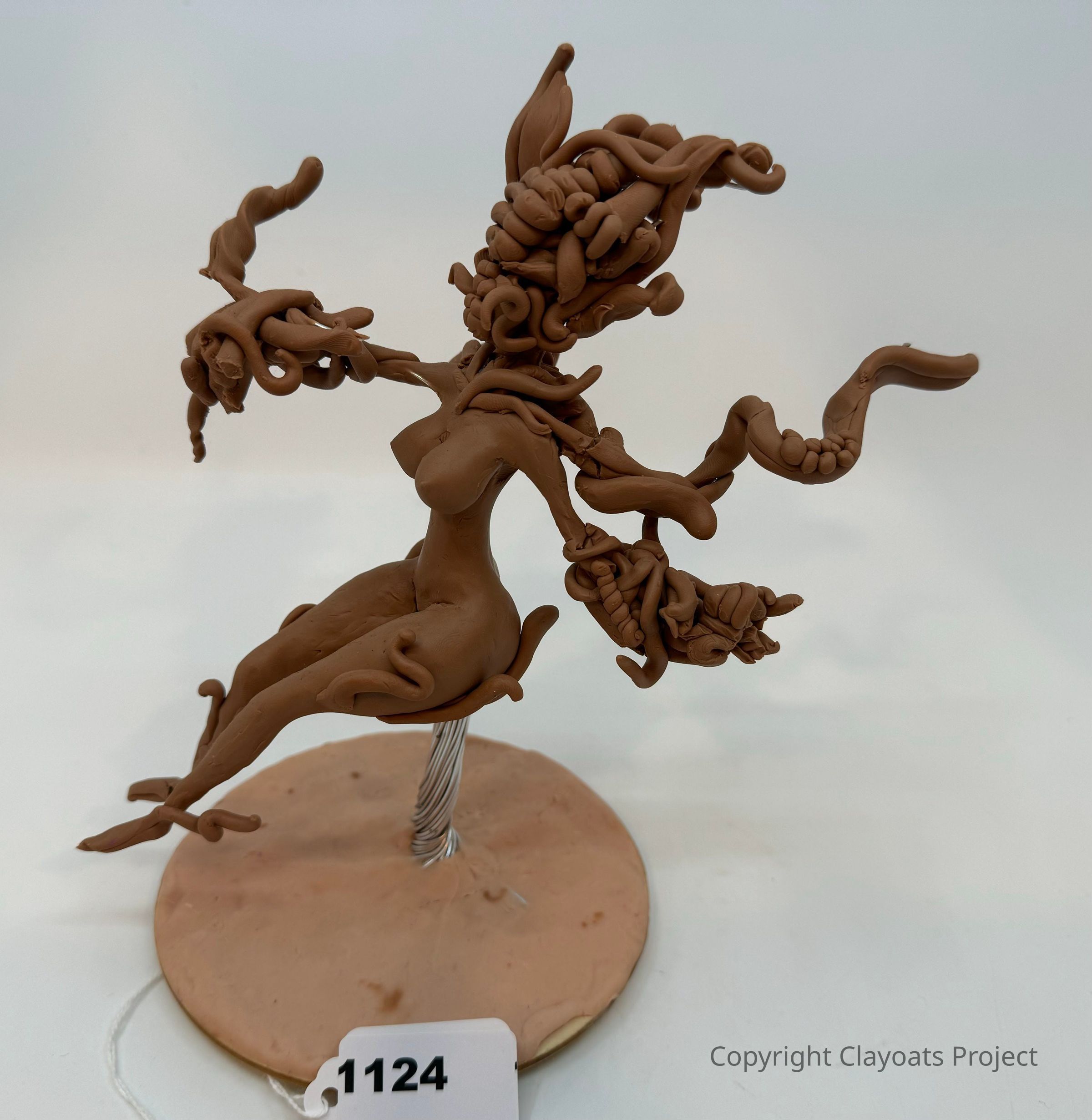 The image showcases an intricate brown clay sculpture that appears to be an abstract representation of a humanoid figure seated on a circular base, with elongated, organic, twisting forms extending from its head, body, and limbs. The sculpture's fantastical design incorporates swirling, tentacle-like extensions that suggest movement and dynamism, while the figure’s proportions, including a distinct torso and legs, convey a surrealistic style. The clay figure stands on a round platform with a visible metal support.