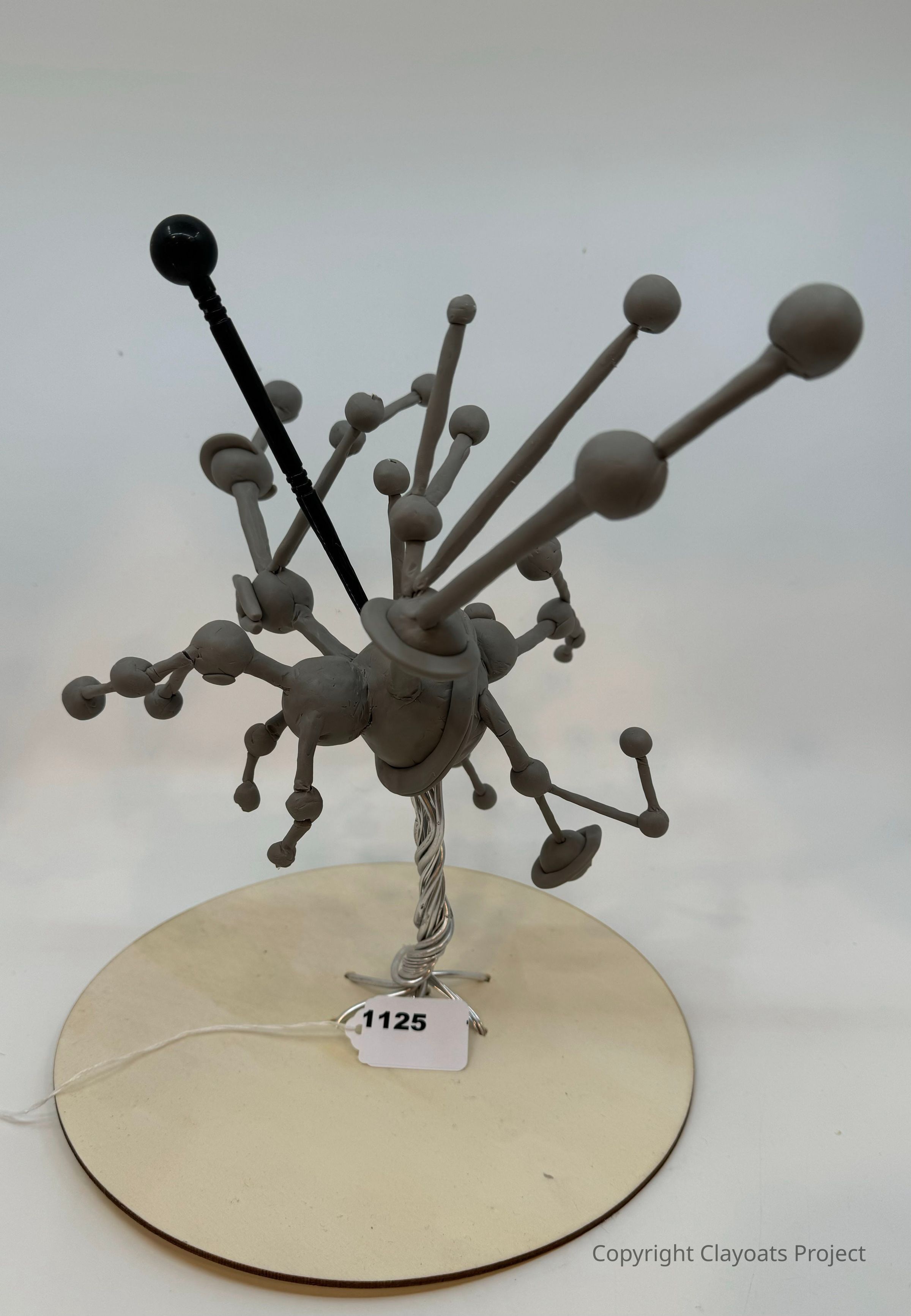 The image depicts a complex abstract sculpture featuring numerous gray rods with spherical ends, intricately interconnected and protruding in various directions, mounted on a round base suggesting a modern artistic representation or a conceptual model of molecular structures.