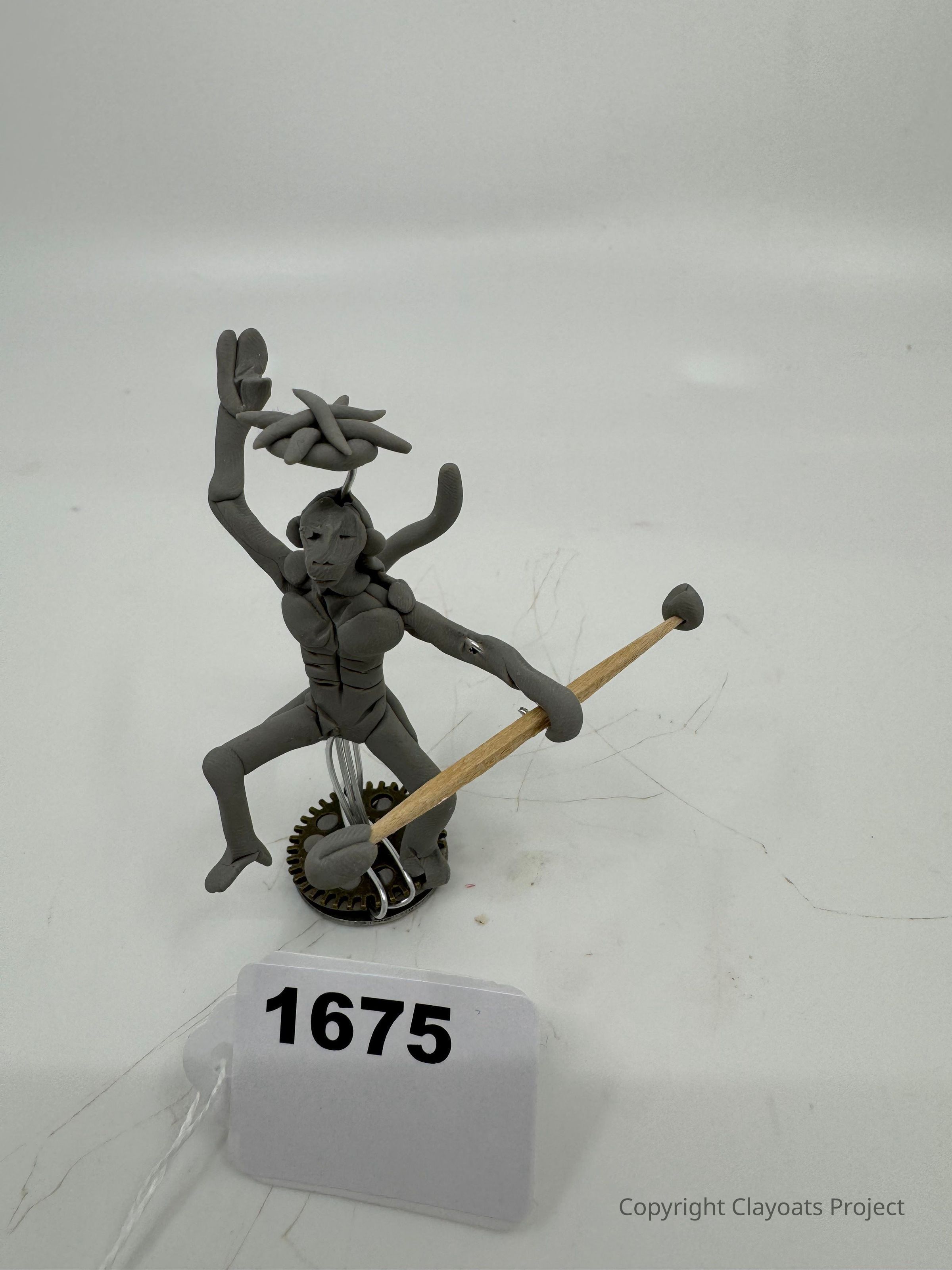 The image depicts a gray clay sculpture of a humanoid figure with elongated limbs. The figure appears to be poised in a dynamic position, balancing on a gear-like base. One hand is raised, holding a cluster of twisted shapes that resemble snakes or ropes, while the other hand holds a wooden stick, suggesting a sense of movement or action. The figure's features are simplified, and it stands on a white backdrop.