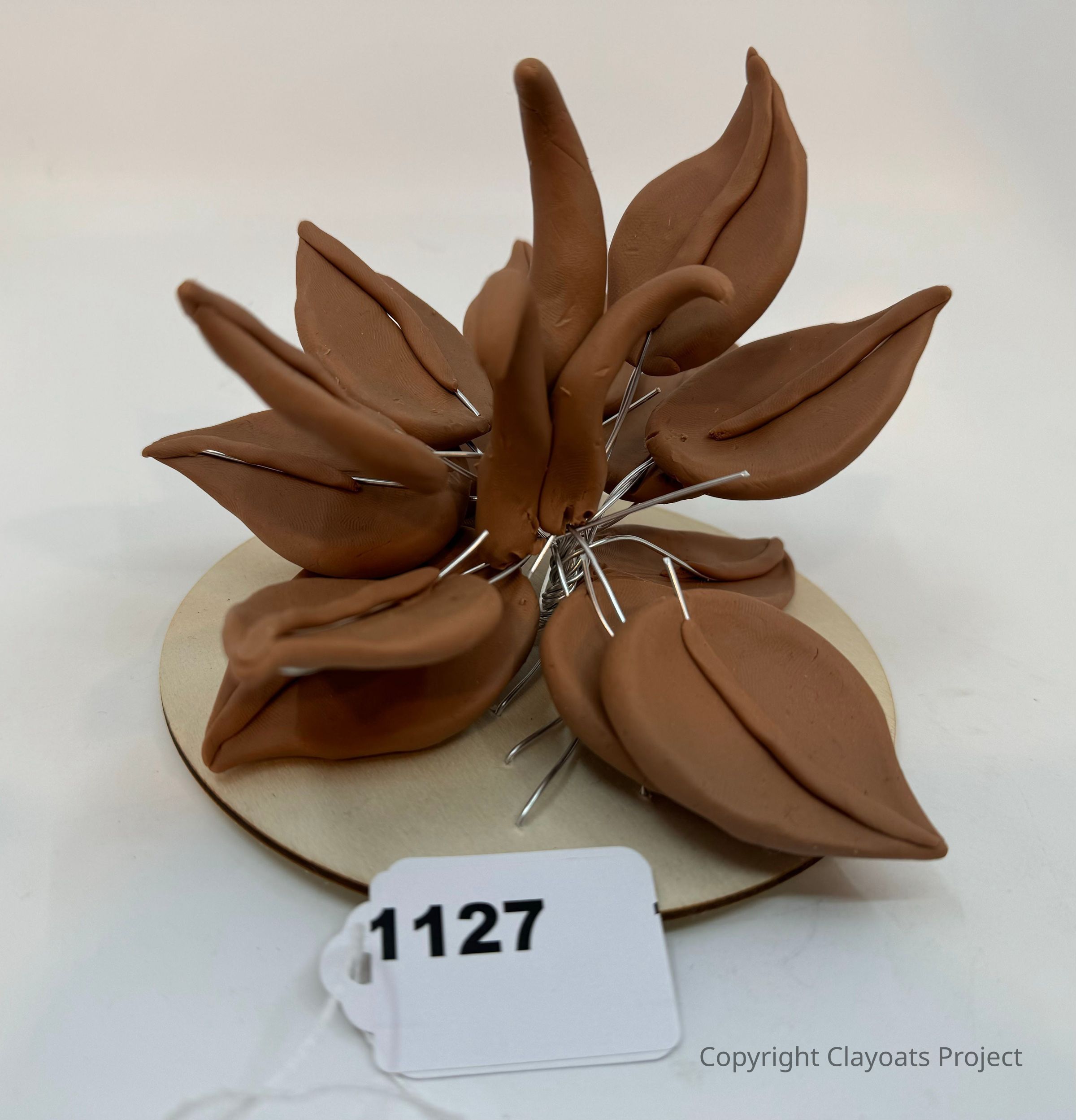 The image depicts a handmade artistic sculpture composed of clay, shaped into multiple abstract, leaf-like forms arranged in a circular pattern, each piece interconnected with thin silver wires extending from the center. The sculpture is placed on a round, flat base, which provides support and stability to the structure. The clay forms have a warm, earthy tone, creating a naturalistic yet abstract aesthetic.
