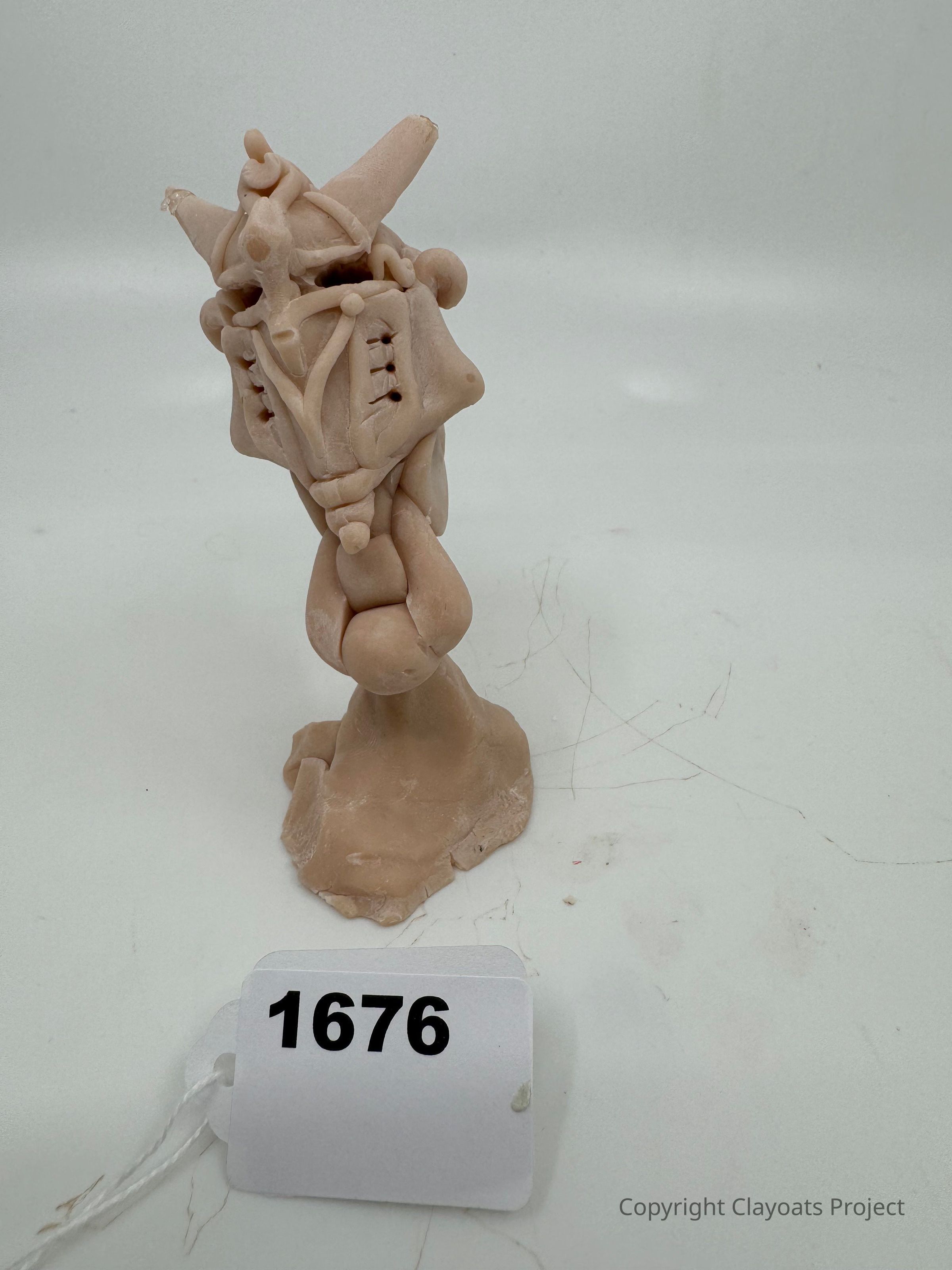 The image shows a small, abstract, clay sculpture with geometric and organic shapes, featuring horn-like protrusions and intricate details, set against a plain white background. The sculpture stands on a flat, irregular base. The design includes various curves, lines, and small nodes, suggesting a fusion between a modern art style and possibly a creature or fantastical theme. The surface appears smooth with natural clay color, enhancing its