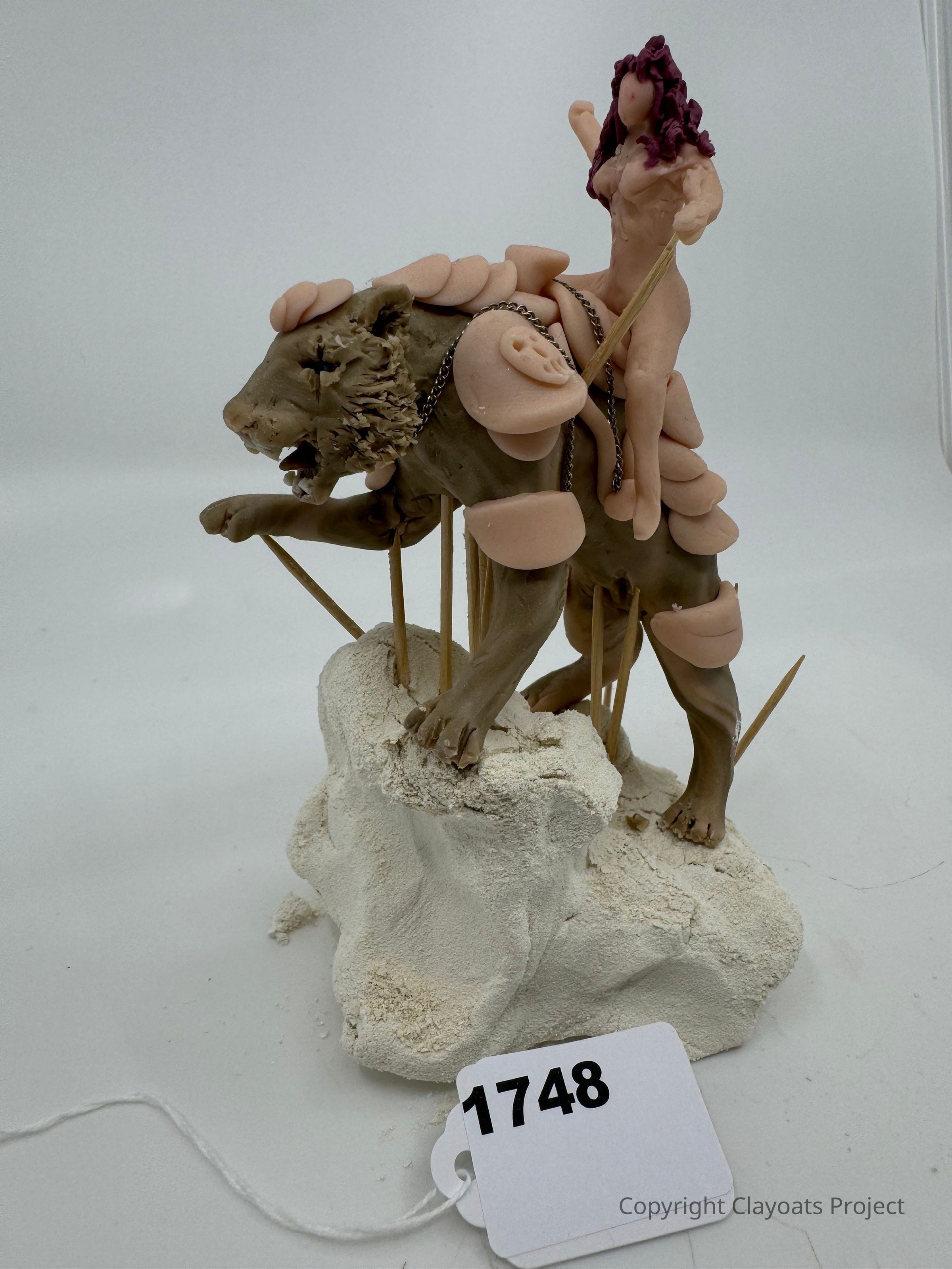 The image depicts a small sculpture of a warrior figure with purple hair riding a stylized animal, resembling a lion, which has been partially covered with pink, plate-like armor pieces. The sculpture rests on a textured white base, with a chain around the animal's body and some wooden sticks protruding from the figure. The figure appears dynamic and expressive, capturing an imaginative scene.