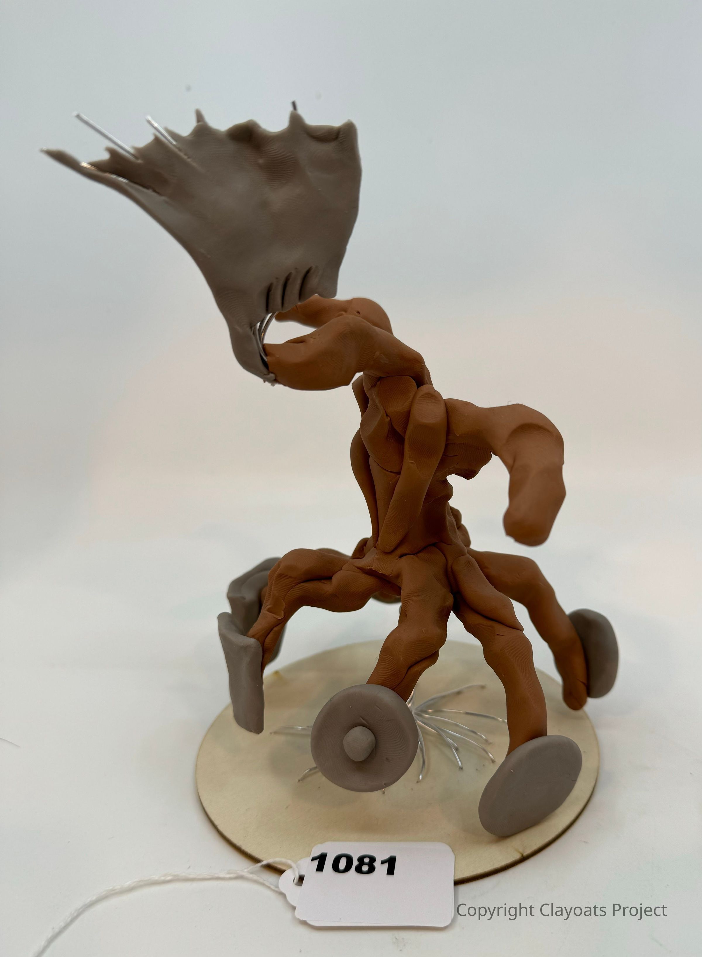 The image shows a unique sculptural piece made from clay, featuring an abstract creature with elongated, twisted limbs forming a base, supporting a gray, fan-like structure atop what could be its head; the sculpture, set on a round platform, includes four disc-like wheels and thin wire accents.