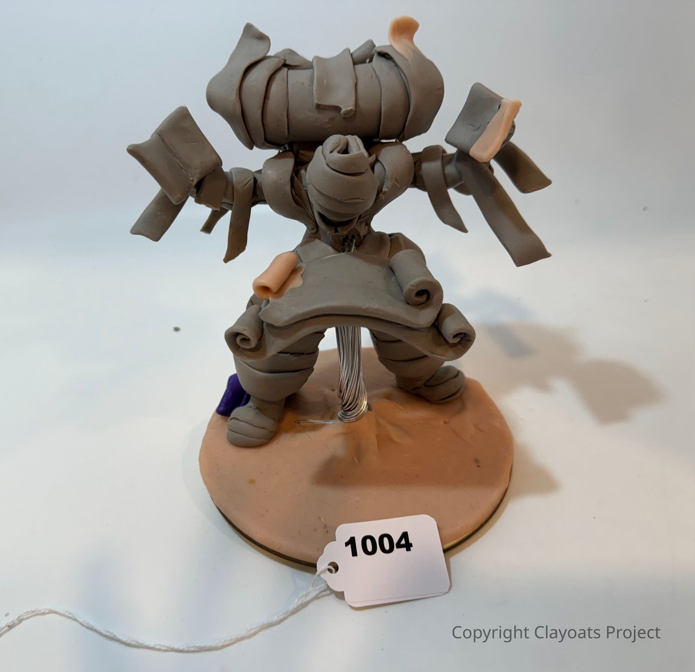 The image shows a detailed clay sculpture of a whimsical, fantasy-inspired character with exaggerated features, resembling a small figure made of rolled-up scrolls, standing on a round base with a tag labeled "1004," featuring appendages and a large, intricate headpiece, giving it a dynamic and artistic appearance against a plain background.