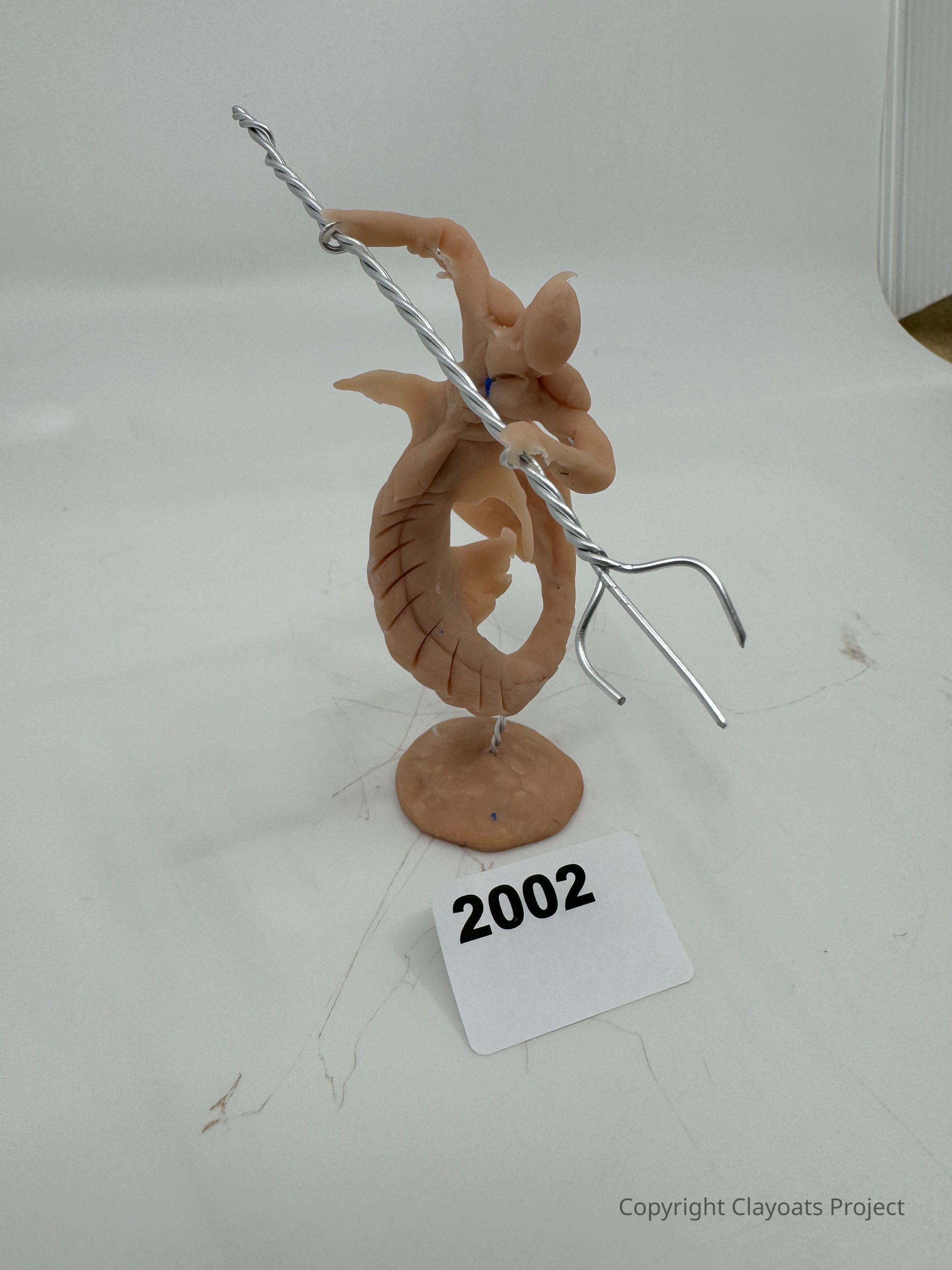 The image showcases a sculptural figure resembling a human-animal hybrid, intricately crafted from clay, with a serpent-like body coiled around a base. The figure is holding a twisted metal trident-like staff, giving the impression of movement and fluidity. The backdrop is plain, accentuating the sculpture's details, such as the scales etched into its tail and subtle facial features. The craftsmanship is emphasized by