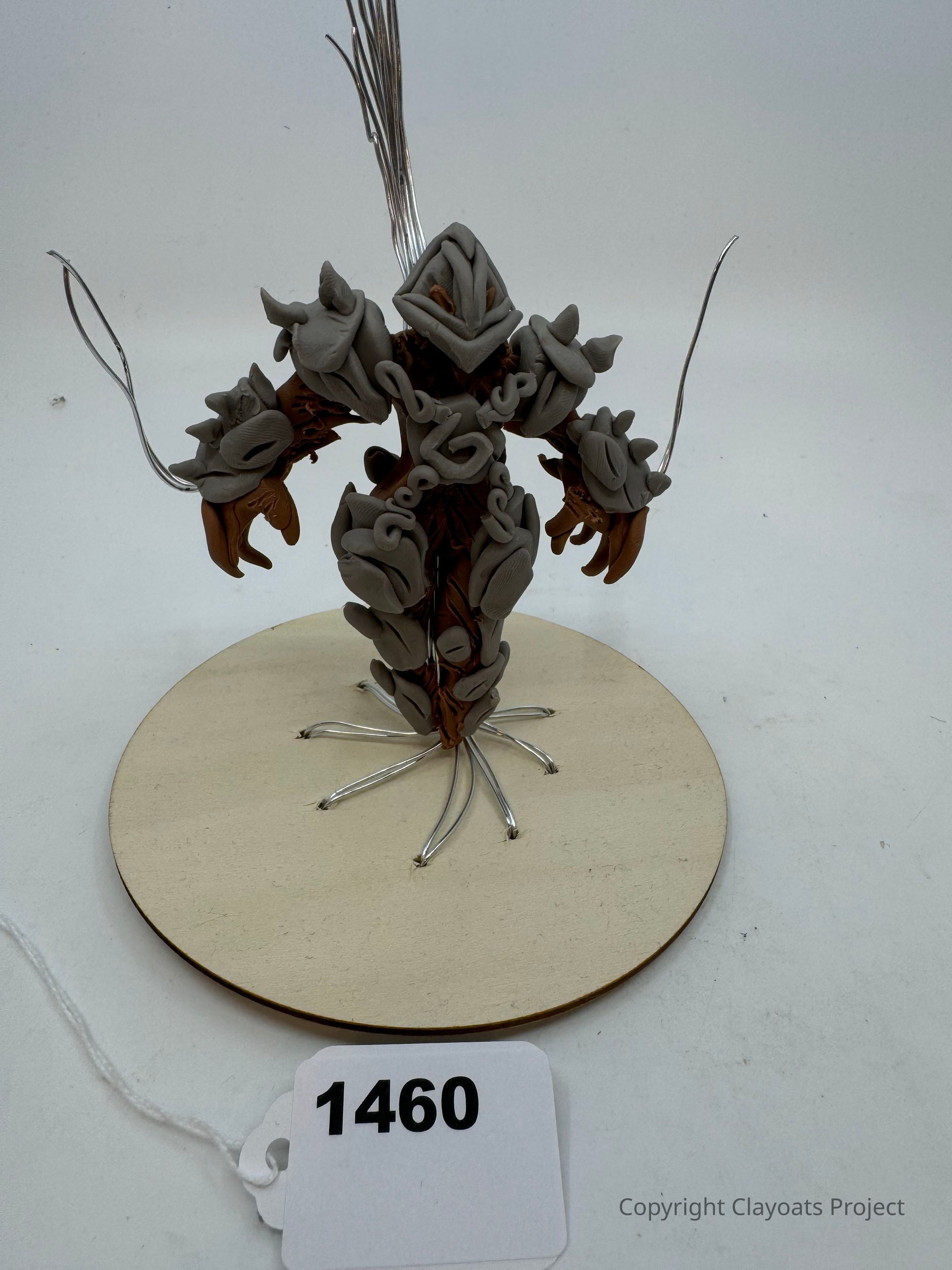 The image showcases a uniquely crafted sculpture resembling a fantasy or mythical armored figure, with intricate details including curved and pointed elements resembling horns and armor plates. The figure is primarily composed of clay, with a color scheme of earthy tones like beige and brown, and has wire extensions protruding from its arms and head. It is mounted on a round wooden base which is adorned with several metallic wires extending from the central figure down to the base, giving the appearance of roots or tentacles.