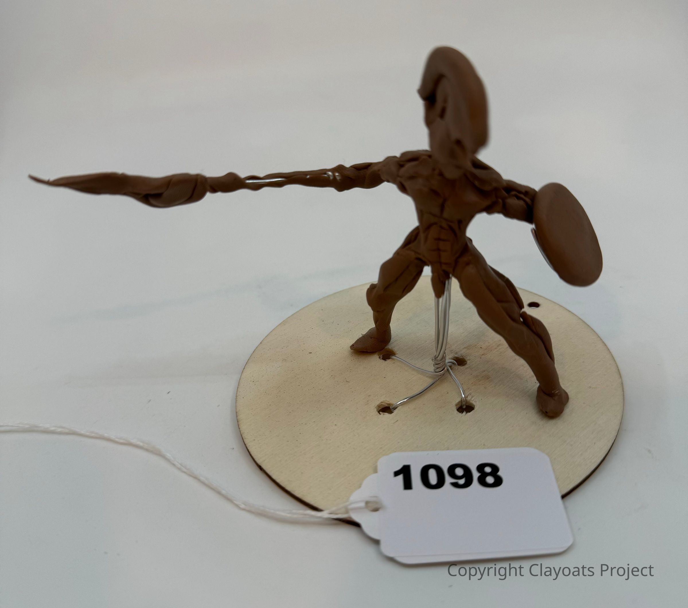 The image shows a detailed clay sculpture of a warrior in an action pose, equipped with a spear in one hand and a shield in the other, situated on a circular wooden base with a metal frame for support. The warrior's muscular form and dynamic stance convey readiness for battle, with attention to detail evident in the sculpting of armor and limbs. The overall setting is minimalistic, focusing on the craftsmanship and intricacy of the sculpture