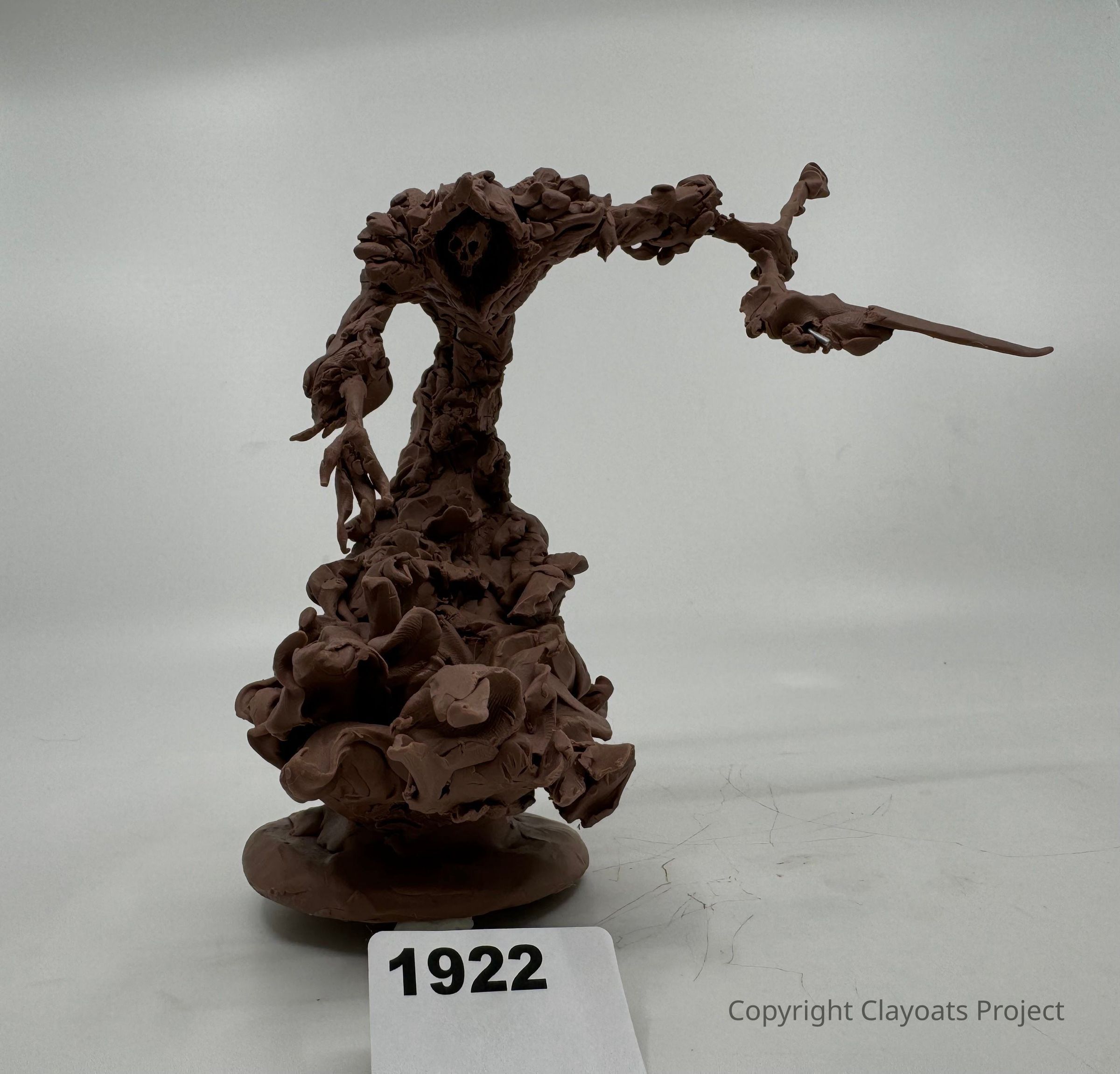 The image depicts a dark, eerie sculpture crafted from clay, featuring a robed, hooded figure with a skull-like face, extending an arm holding a long, skeletal sickle. The base of the sculpture is designed with swirling, organic shapes that add an unsettling, supernatural quality. It stands against a plain backdrop, casting shadows that enhance its menacing presence.
