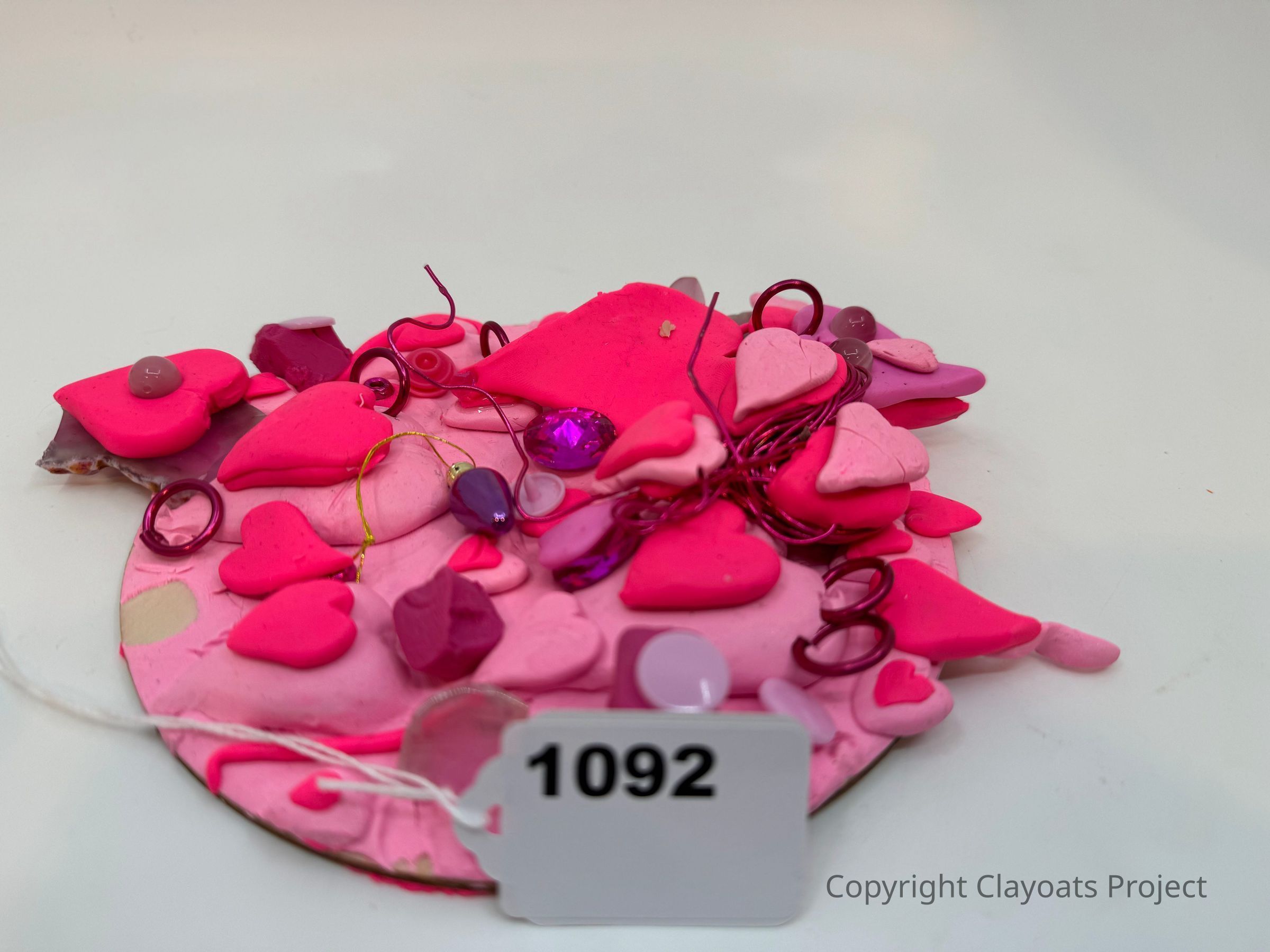 The image displays a creatively crafted object with a round base, adorned with various pink heart-shaped decorations and colorful beads. Some elements are made of different shades of pink, and there are also several rounded purple accents alongside swirling wire embellishments, adding texture and vibrancy to the piece. The design includes reddish rings wrapping around some parts, creating a layered and intricate effect.