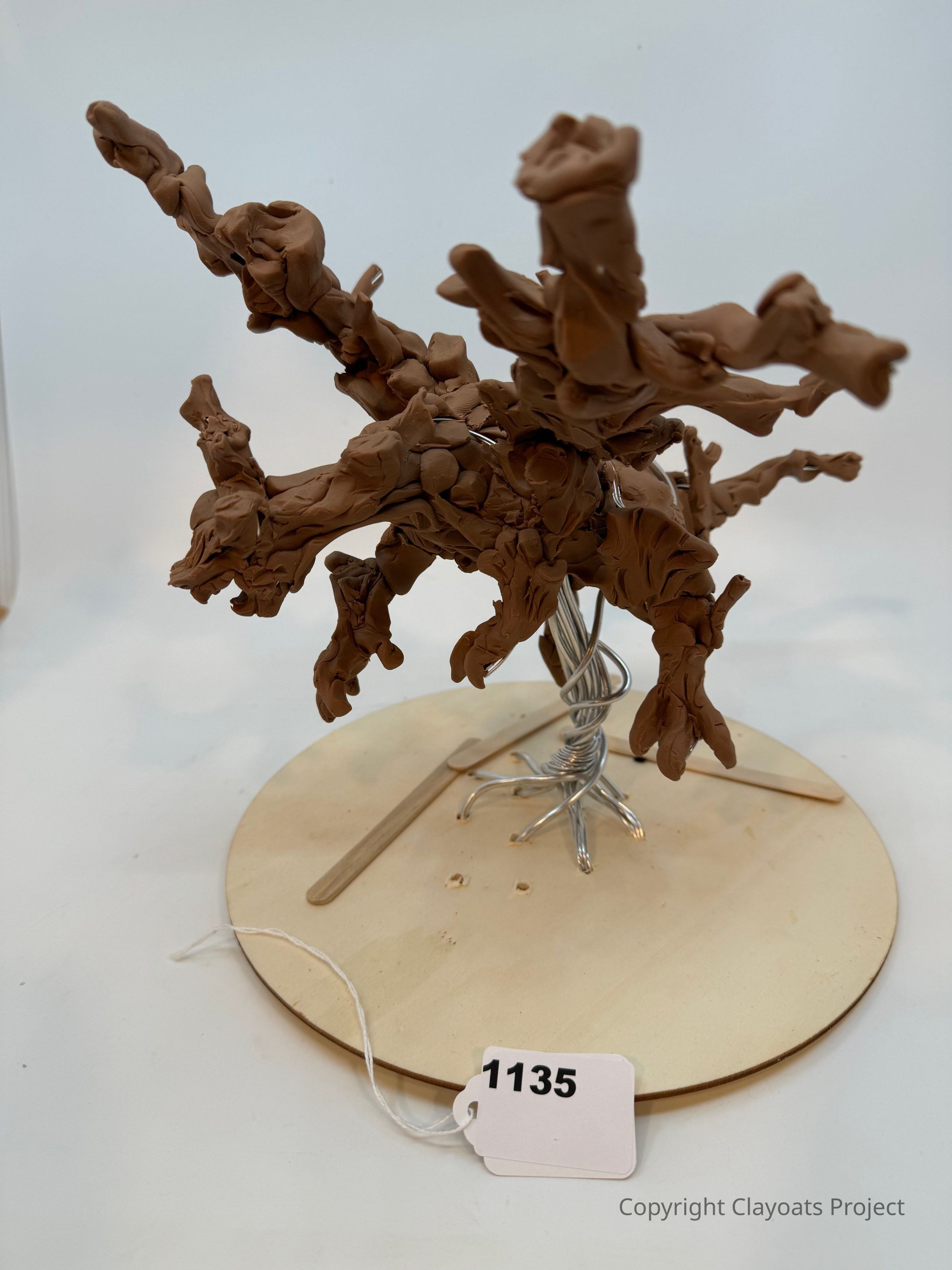 The image shows an abstract sculpture crafted from brown clay, featuring intricate, twisting forms that extend upwards in various directions, resembling branches or flowing organic shapes, all supported by a twisting metal wire structure secured to a round wooden base; and the neutral, light-colored background highlights the details of the artwork, creating a stark contrast that emphasizes its elaborate and textured design.