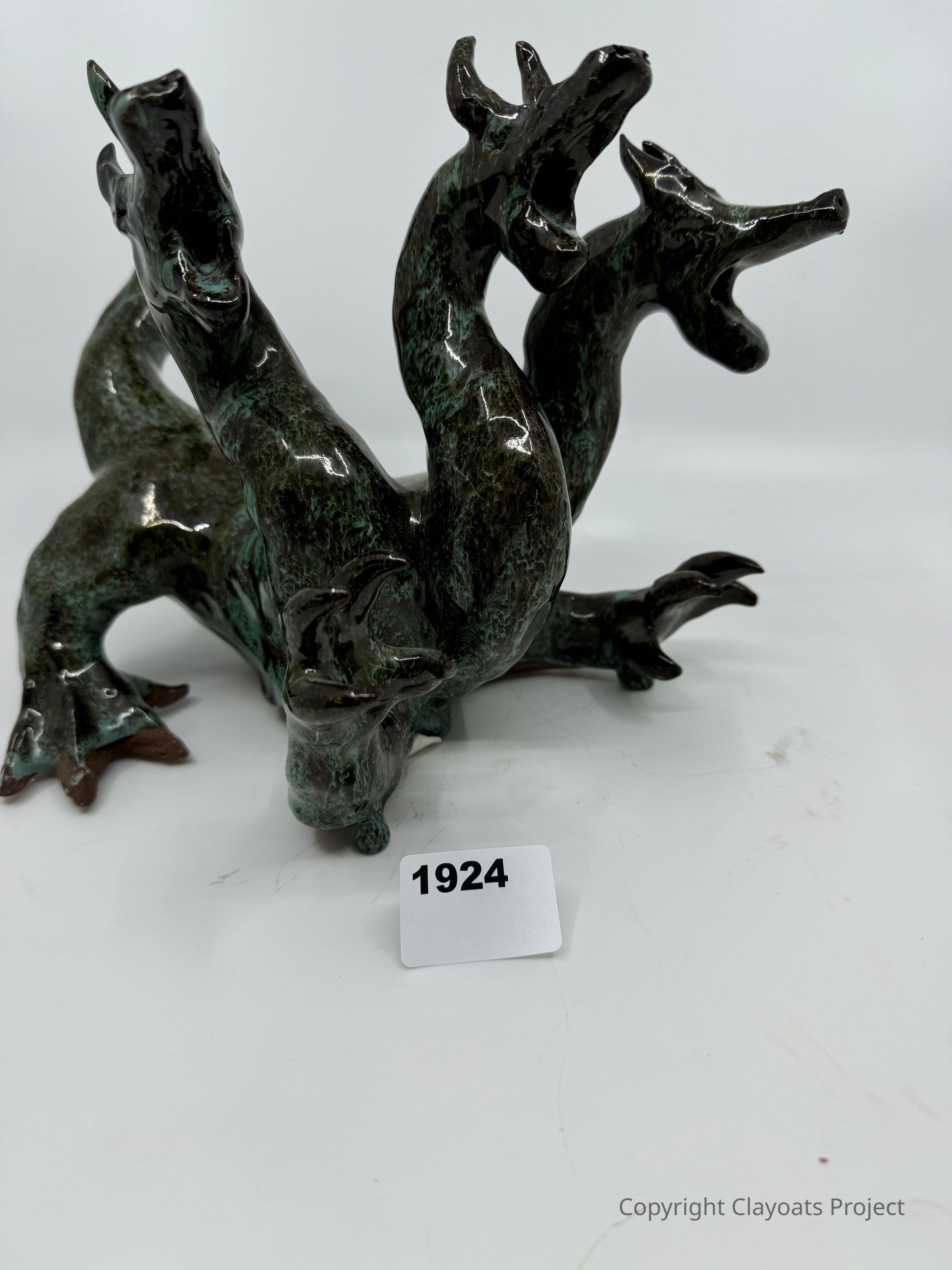 The image depicts a ceramic sculpture of a dragon with multiple heads, crafted in a dark, glossy finish with hints of green. The creature is positioned with its heads raised, showcasing fierce expressions, while its body is grounded by four legs. Each head features sharp, elongated snouts and pointed ears, contributing to its mythical appearance. The sculpture rests on a smooth, white surface. The artwork combines intricate detailing with a captivating