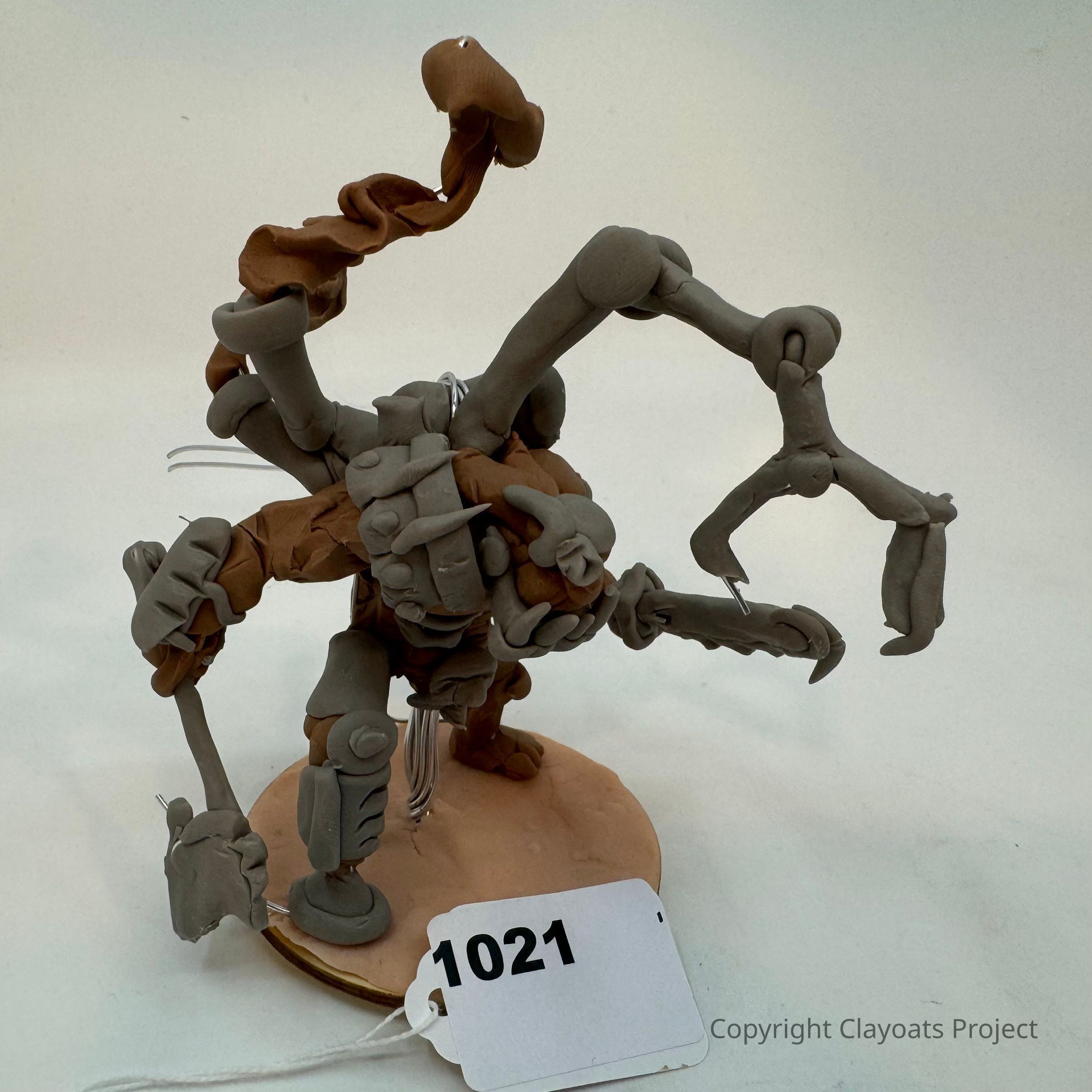 The image features a sculpted creature made of clay, showcasing intricate details and a dynamic pose. It stands on a circular base. The creature has multiple limbs and appendages, including large claw-like hands and a twisting, serpent-like extension emerging from its back. The color palette of the sculpture is primarily grey, with some areas in a brownish hue. The creature’s design suggests a sense of movement and a blend of organic and mechanical elements, creating an