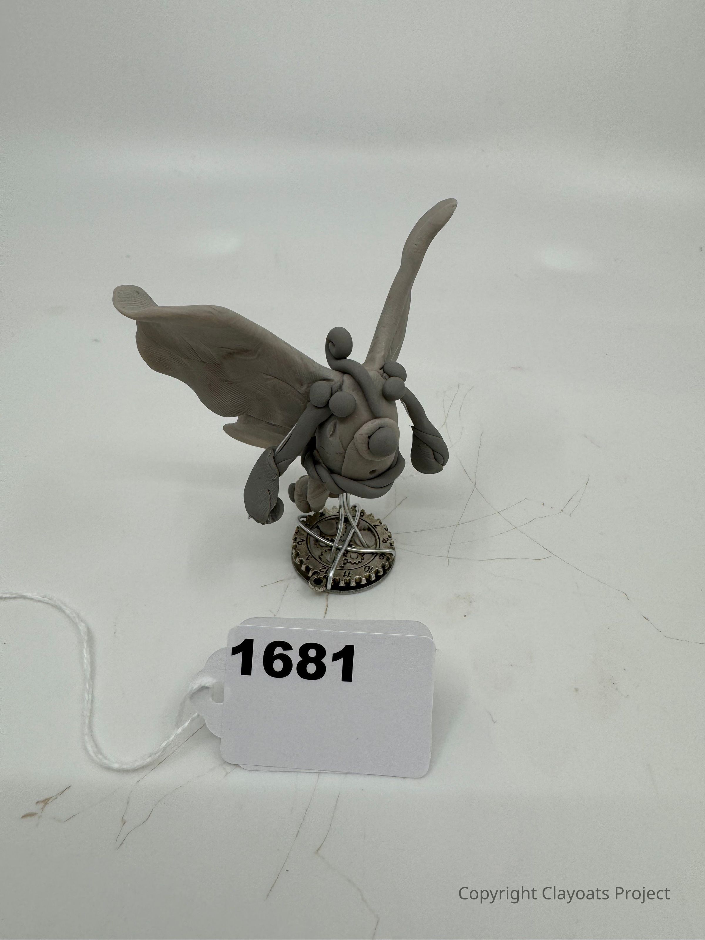 The image showcases a gray clay sculpture of a creature with large wings, placed on an intricately designed base. The creature seems to have elongated limbs and abstract features, possibly suggesting an insect or mythical being. . The background is plain and white, with faint sketch-like lines visible on the surface, contributing to a minimalist and artistic presentation.