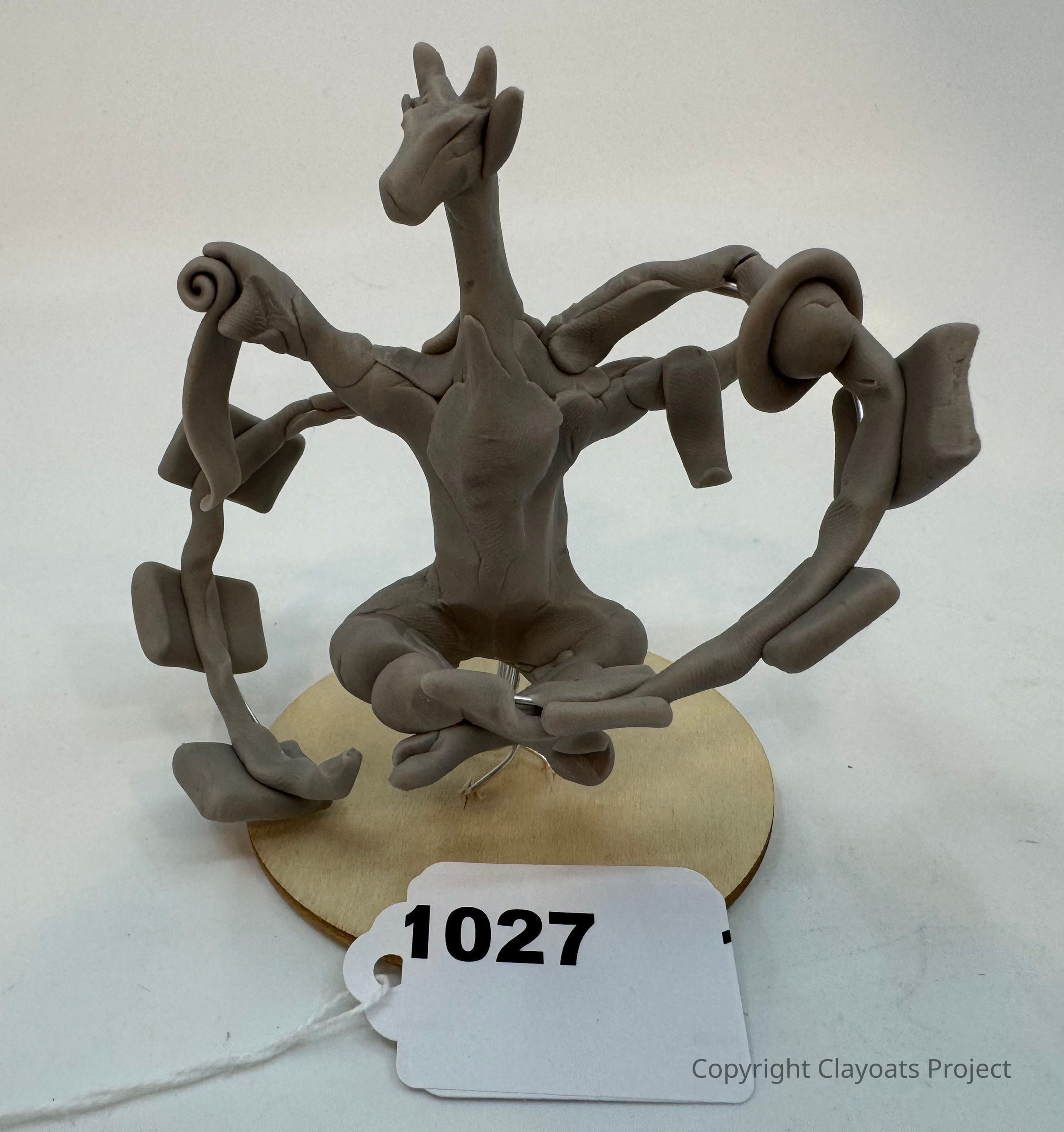 The image features a clay sculpture of a fantastical creature resembling a giraffe, with a humanoid torso and elongated limbs, sitting cross-legged on a wooden base. The creature possesses multiple arms, each adorned with spirals, loops, and flat shapes. The sculpture exhibits a whimsical and abstract design, The artwork rests against a plain white background, emphasizing the intricate and imaginative details of the creature's form and structure.