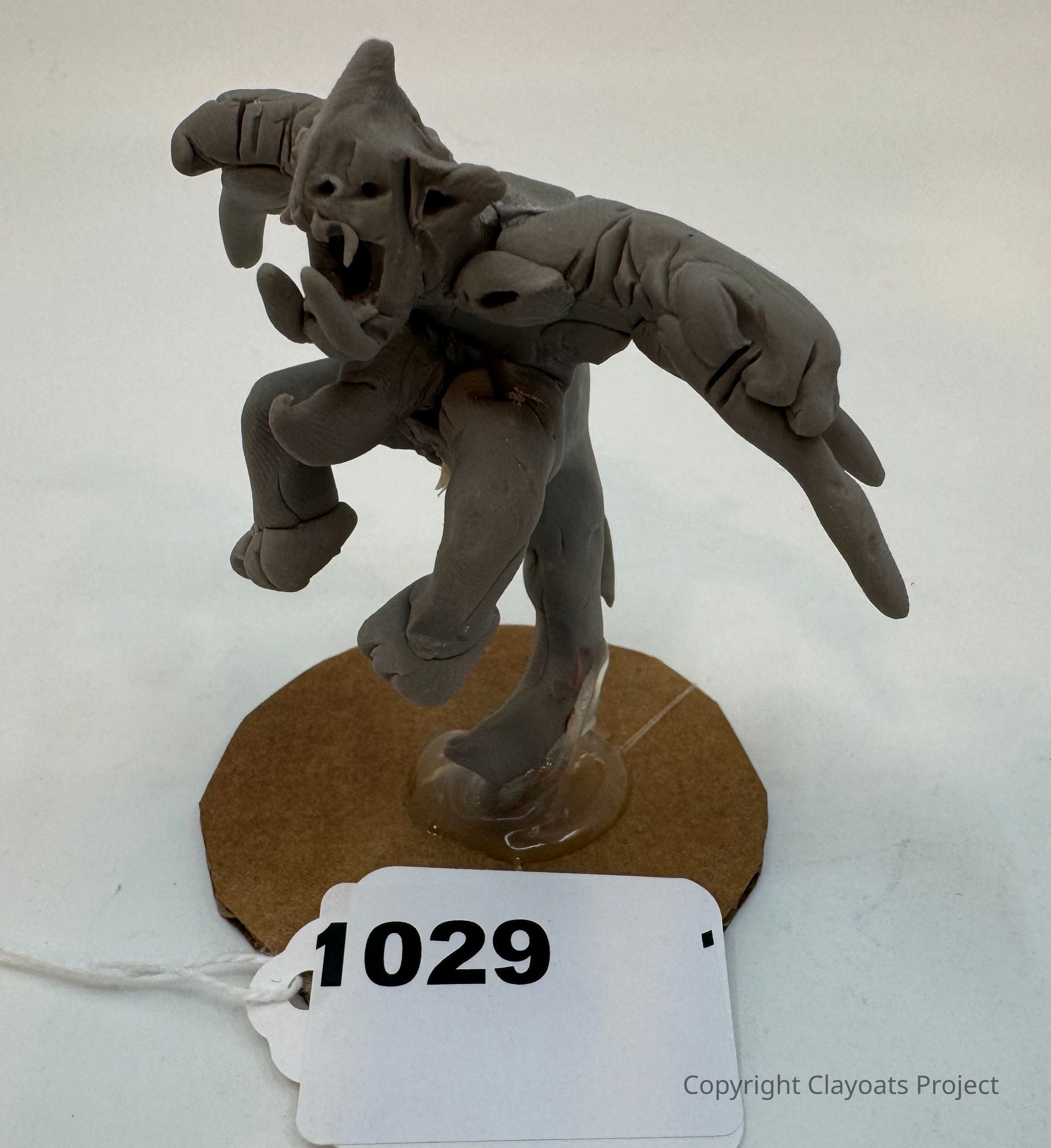 The image depicts a small, gray, intricately sculpted clay figure resembling a fantastical creature with exaggerated features, large hands and feet, and a dynamic, expressive posture, mounted on a brown, round base.